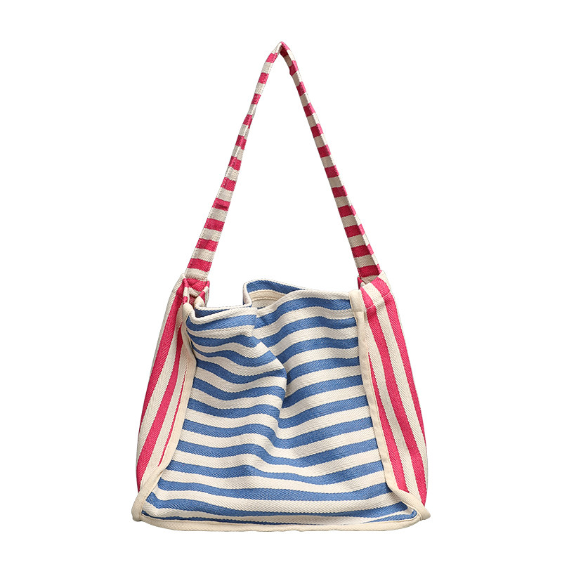慵懒风大容量帆布托特包女百搭撞色条纹单肩包学生宽肩带斜挎布袋