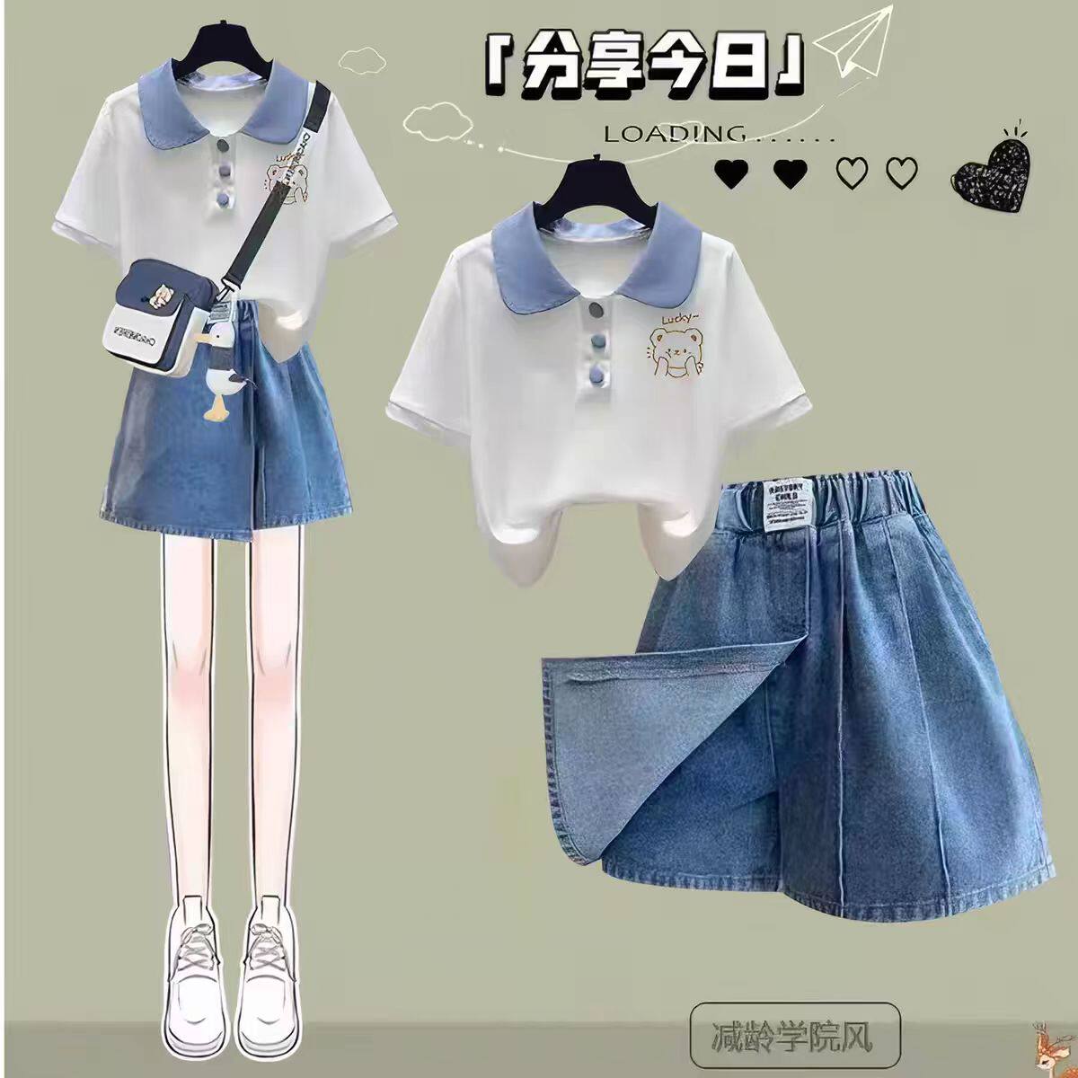 青少年学院风polo领短袖T恤套装女夏季2件套大童初中生穿搭一整套