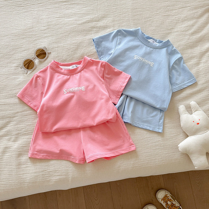 夏季新款男女童套装儿童韩版短袖T恤短裤两件套纯色印花休闲童装