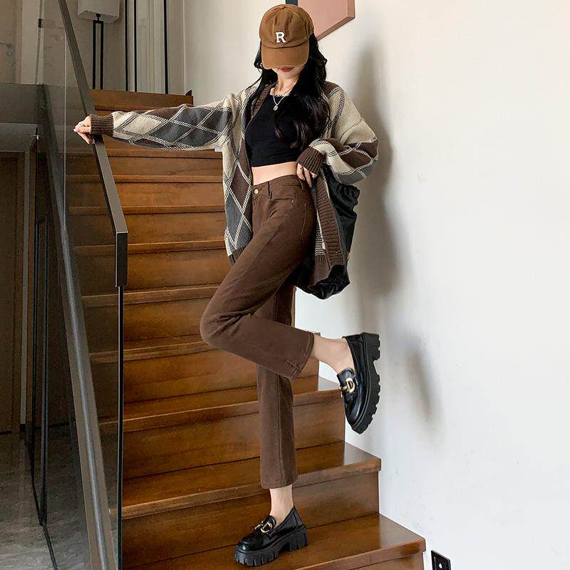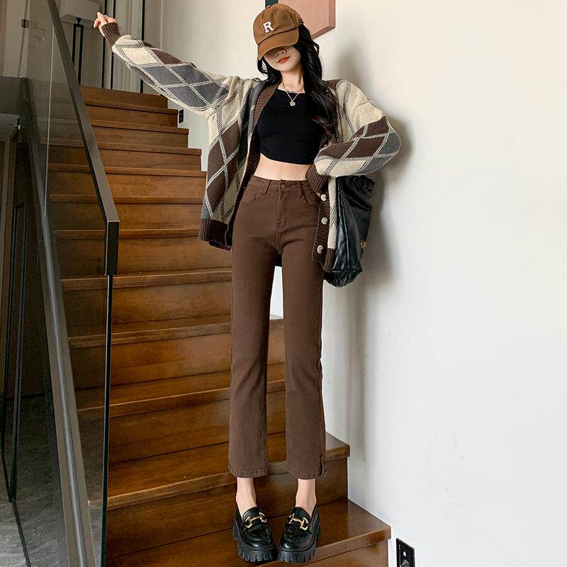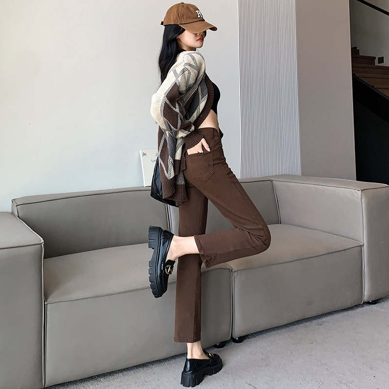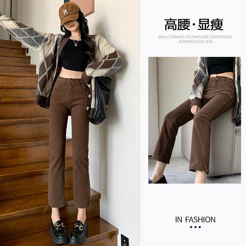 咖啡色直筒牛仔裤女2026年春夏新款高腰显瘦九分小个子开叉烟管裤