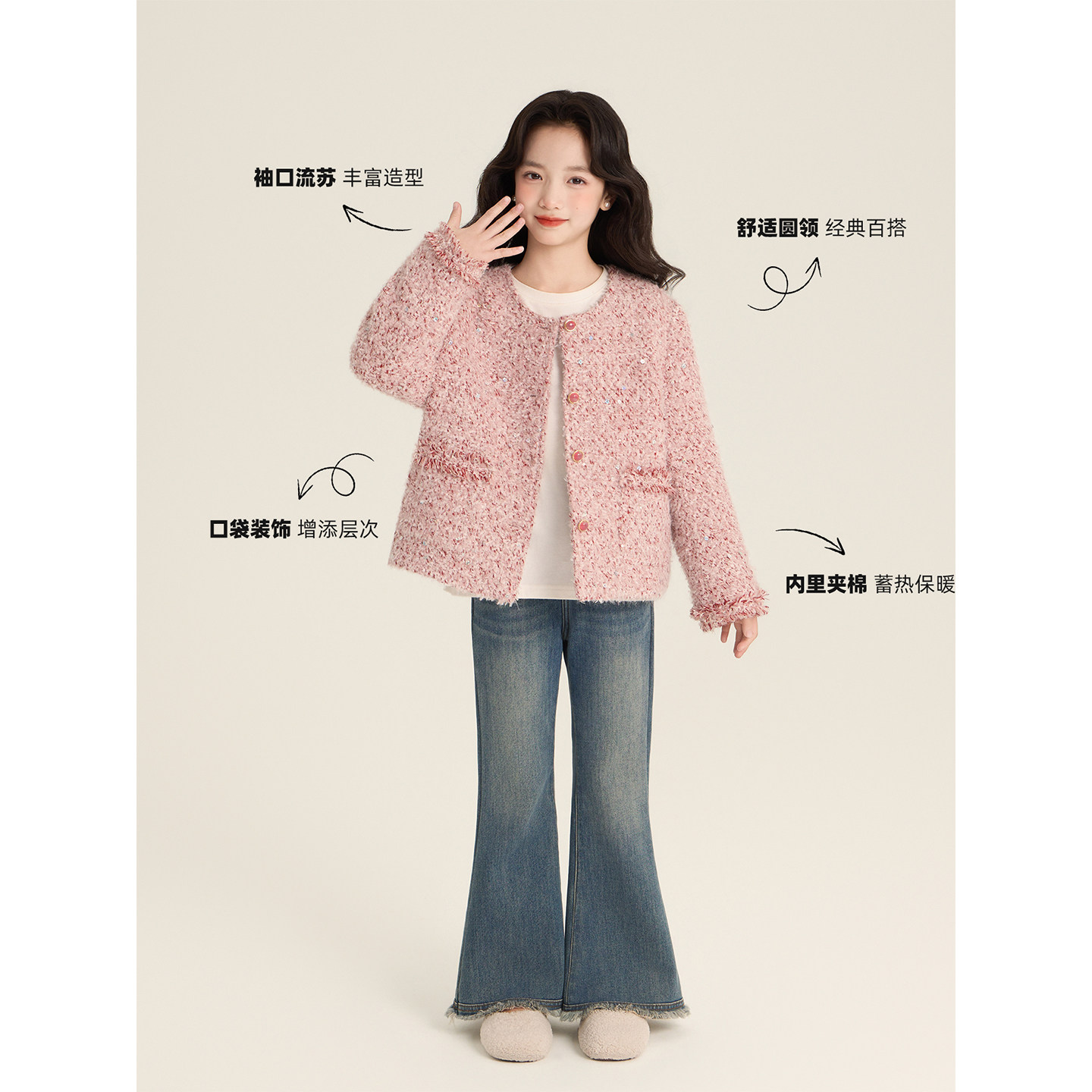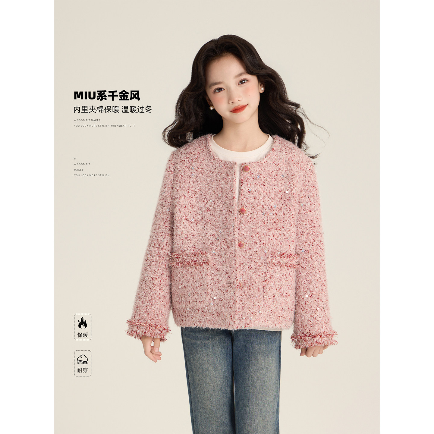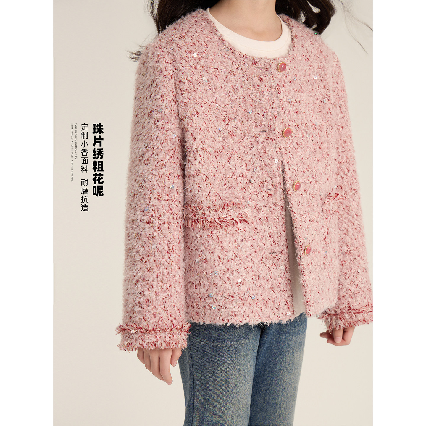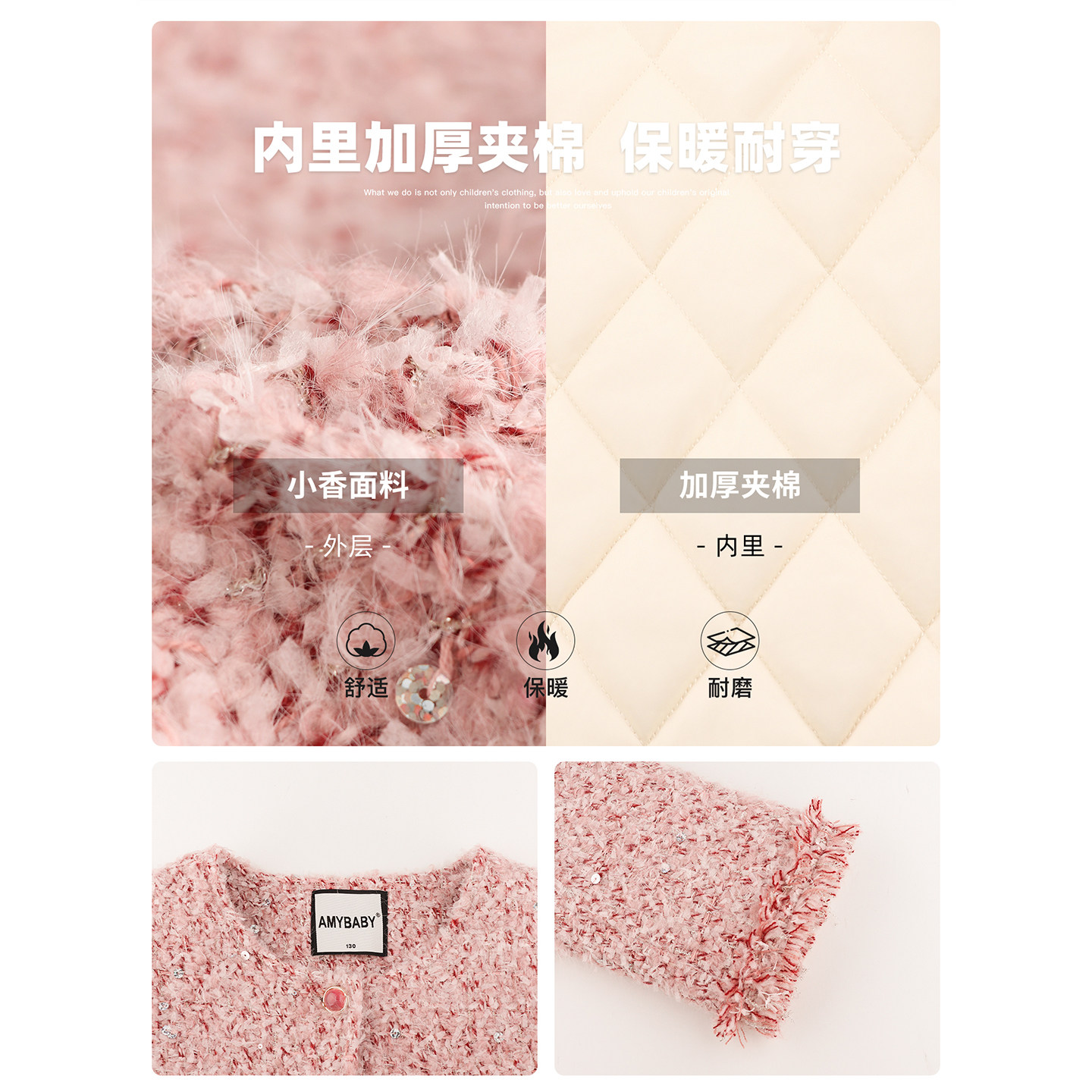 Amybaby女童上衣冬季2025新款冬季粉色精致miu系小香风珠片外套