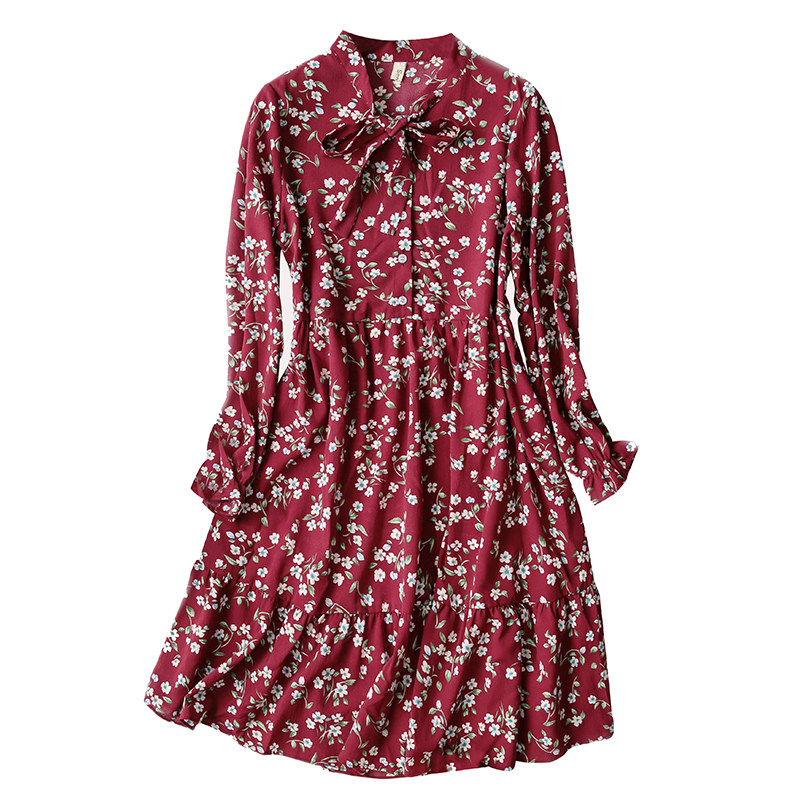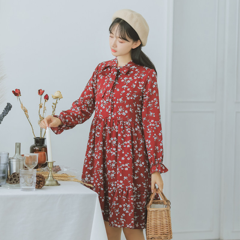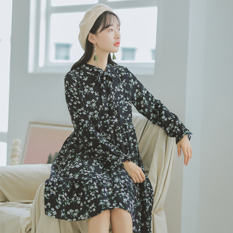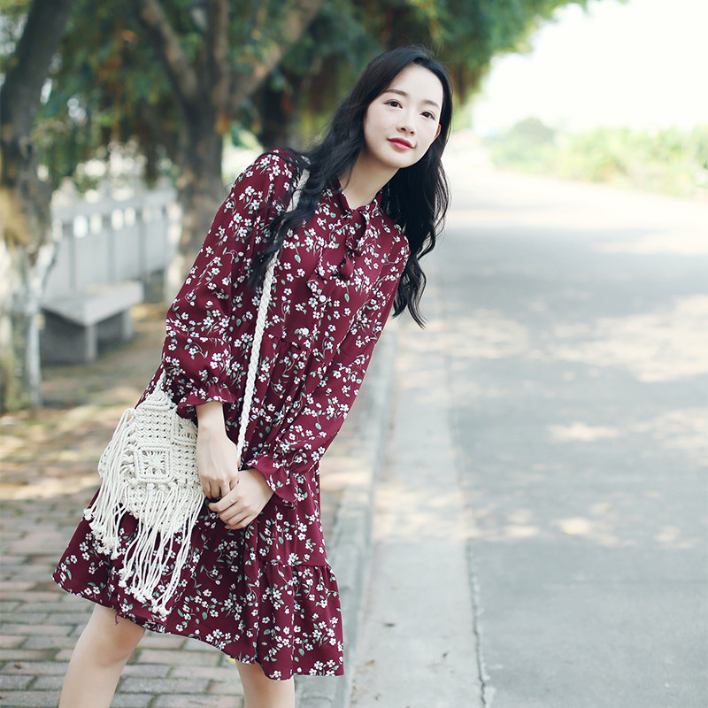森系小清新小雏菊碎花连衣裙短款 小个子A字裙春秋雪纺连衣裙长袖