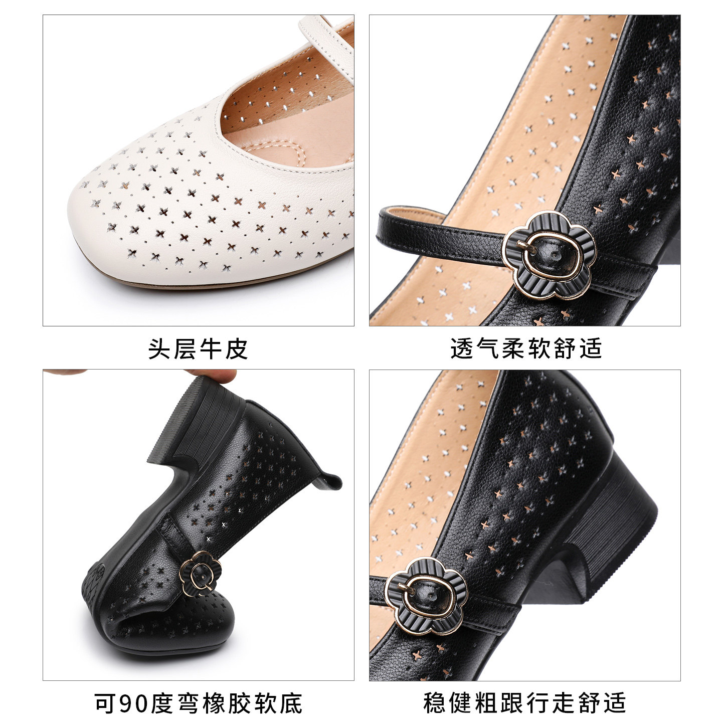 真皮女鞋镂空透气凉鞋女平底低跟单鞋皮鞋软底中年妈妈鞋夏天鞋子