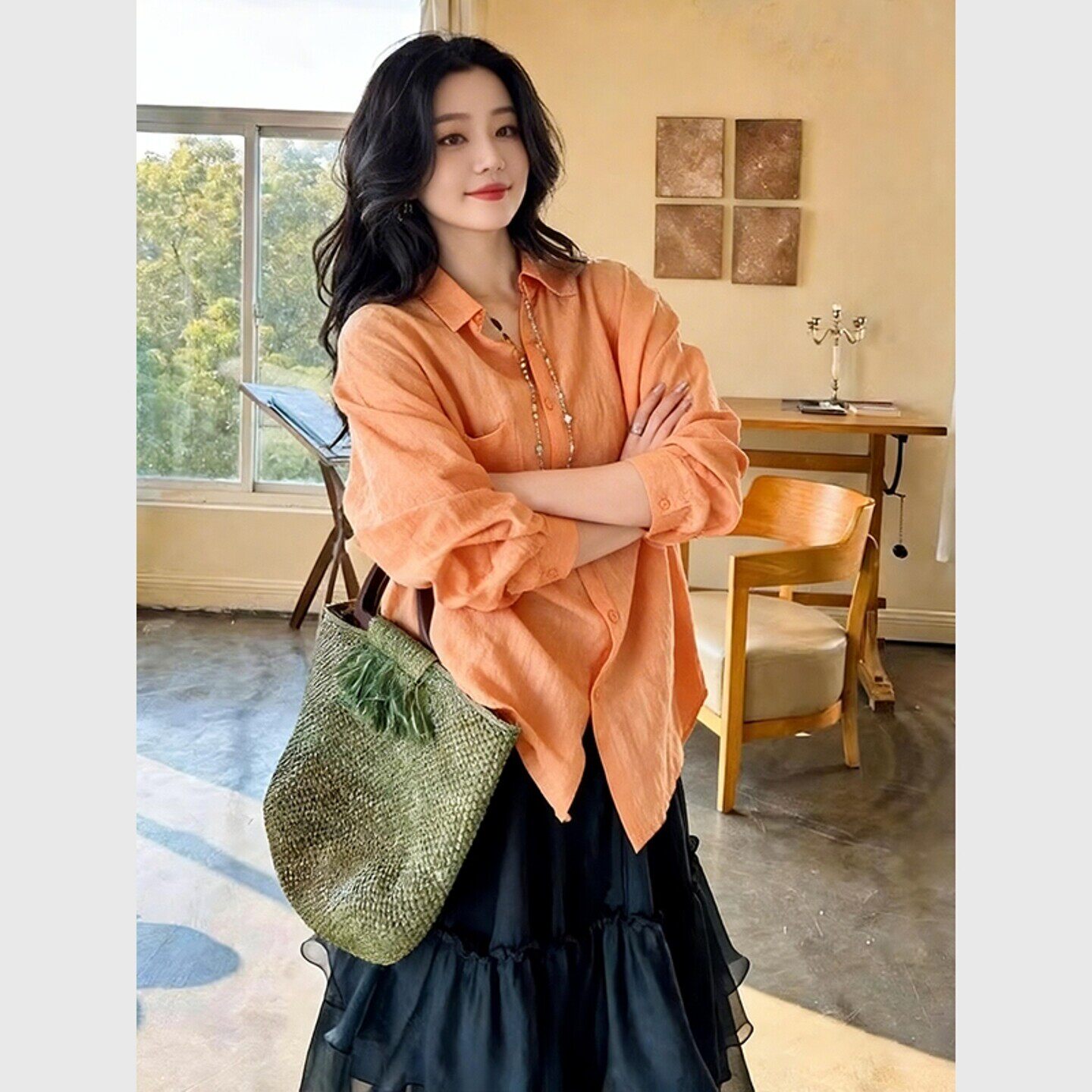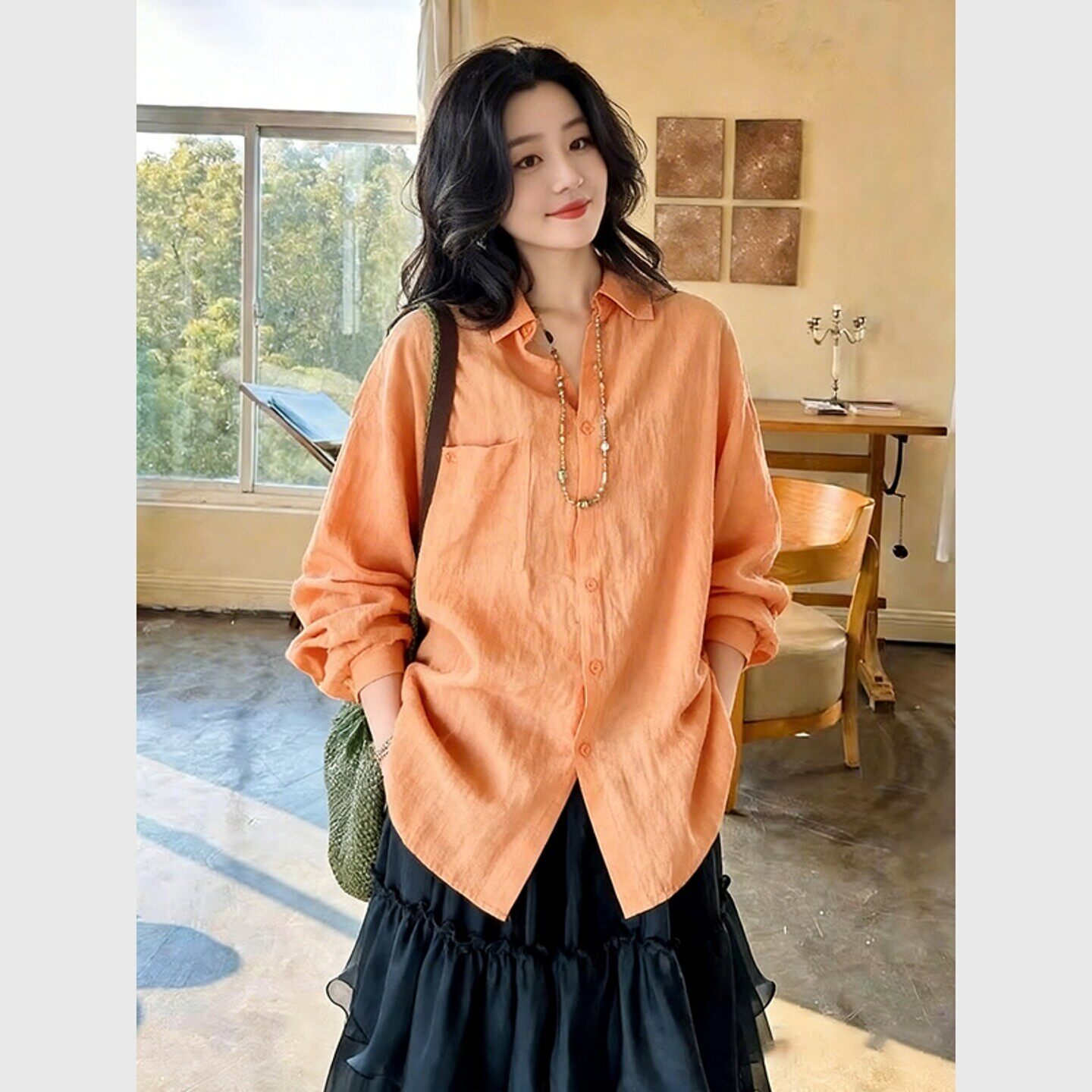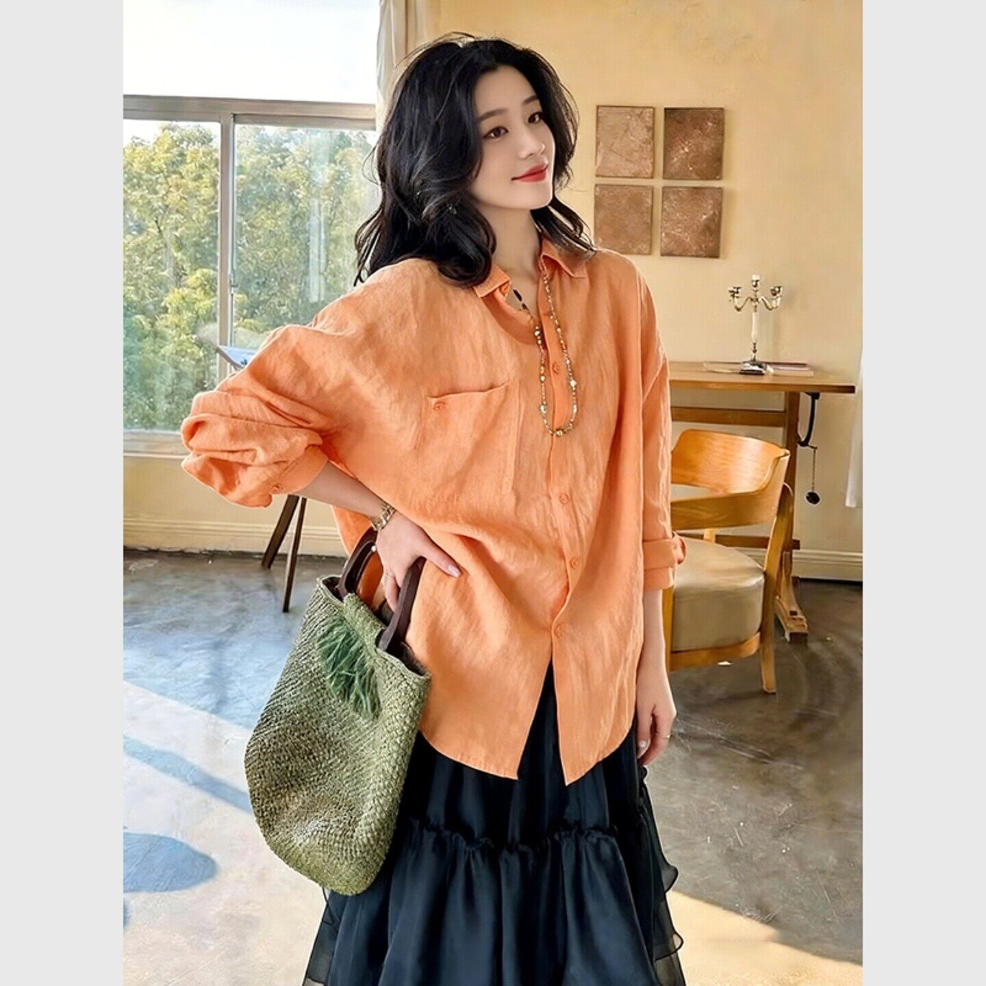 橘色棉麻防晒衬衫女款2026新款设计感春装多巴胺通勤穿搭显瘦上衣
