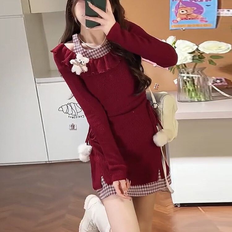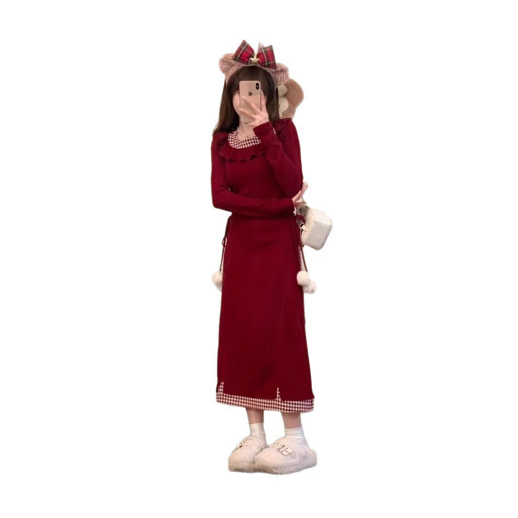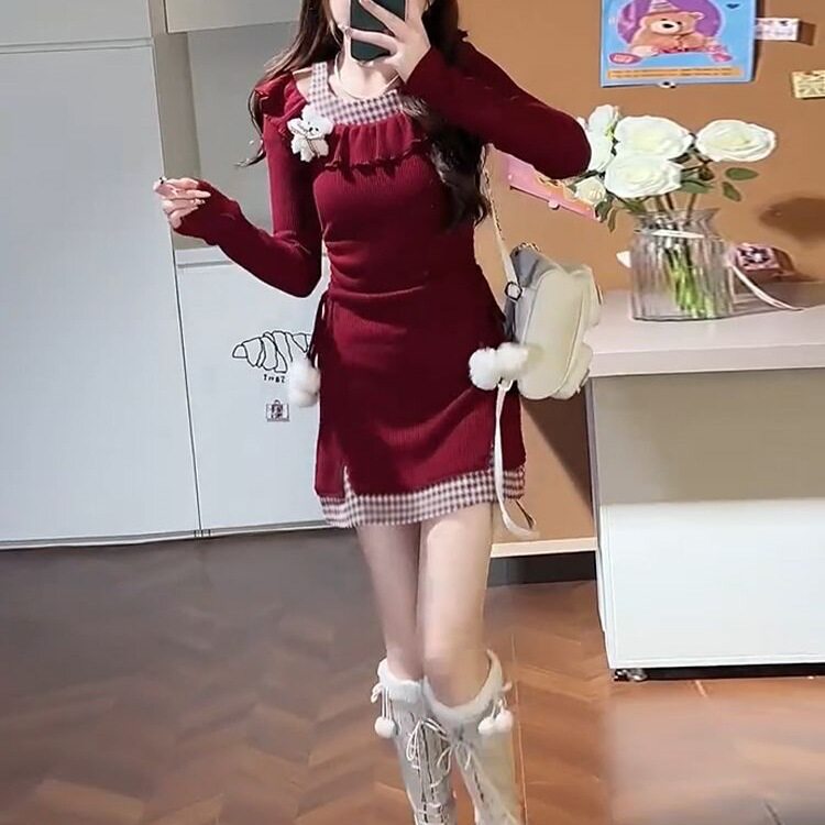 辣妹圣诞红色格子荷叶连衣裙长袖针织冬季新款收腰显瘦短裙裙子女