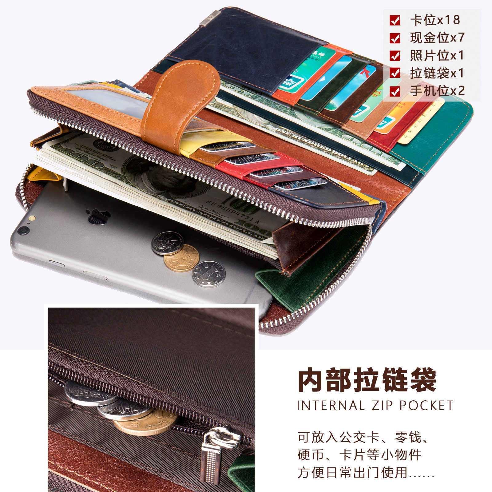 女士高级感真皮长款钱包大容量钱夹三折钱包头层牛皮零钱包手拿包