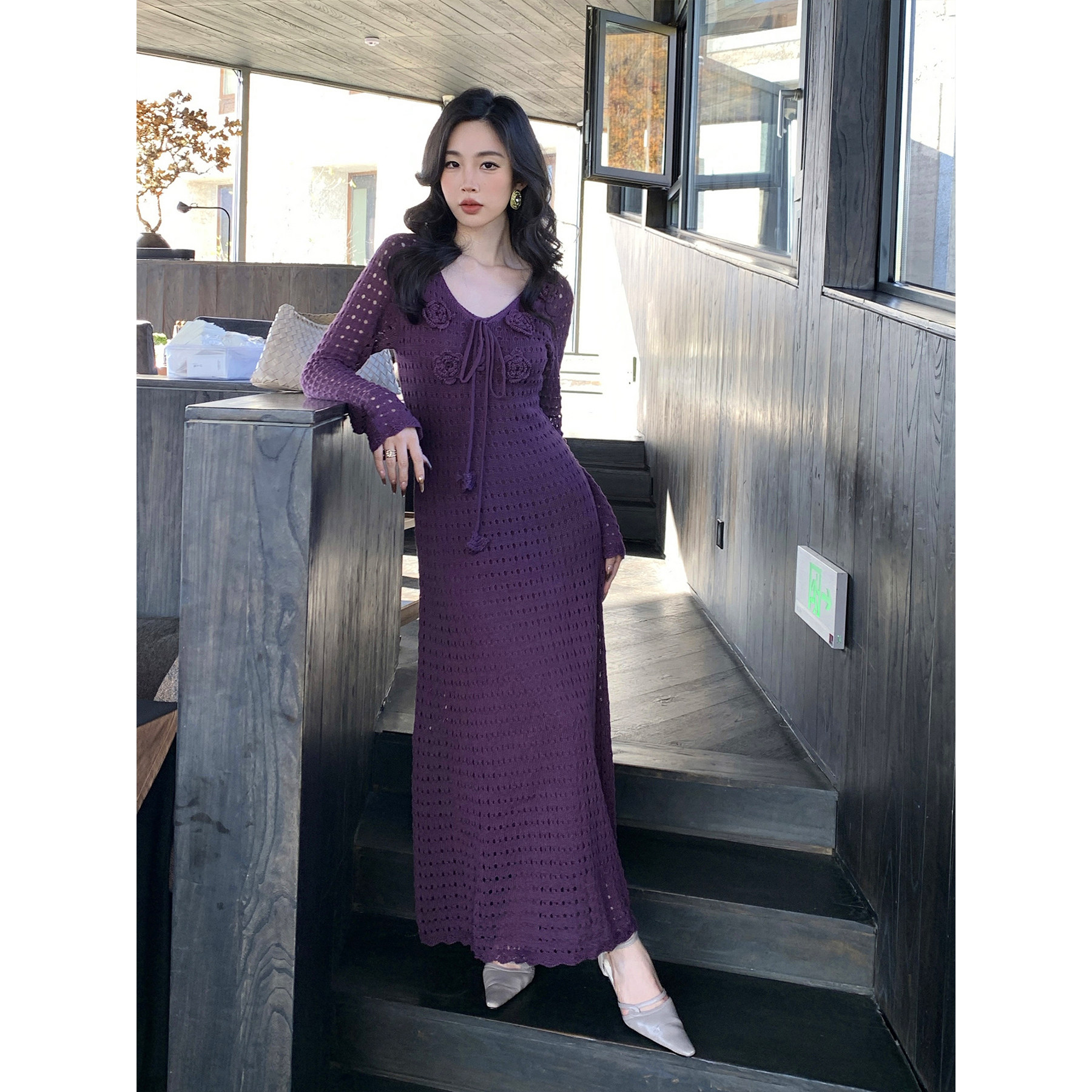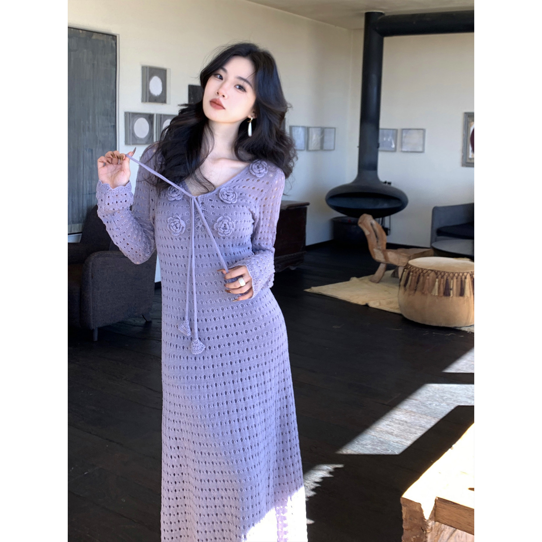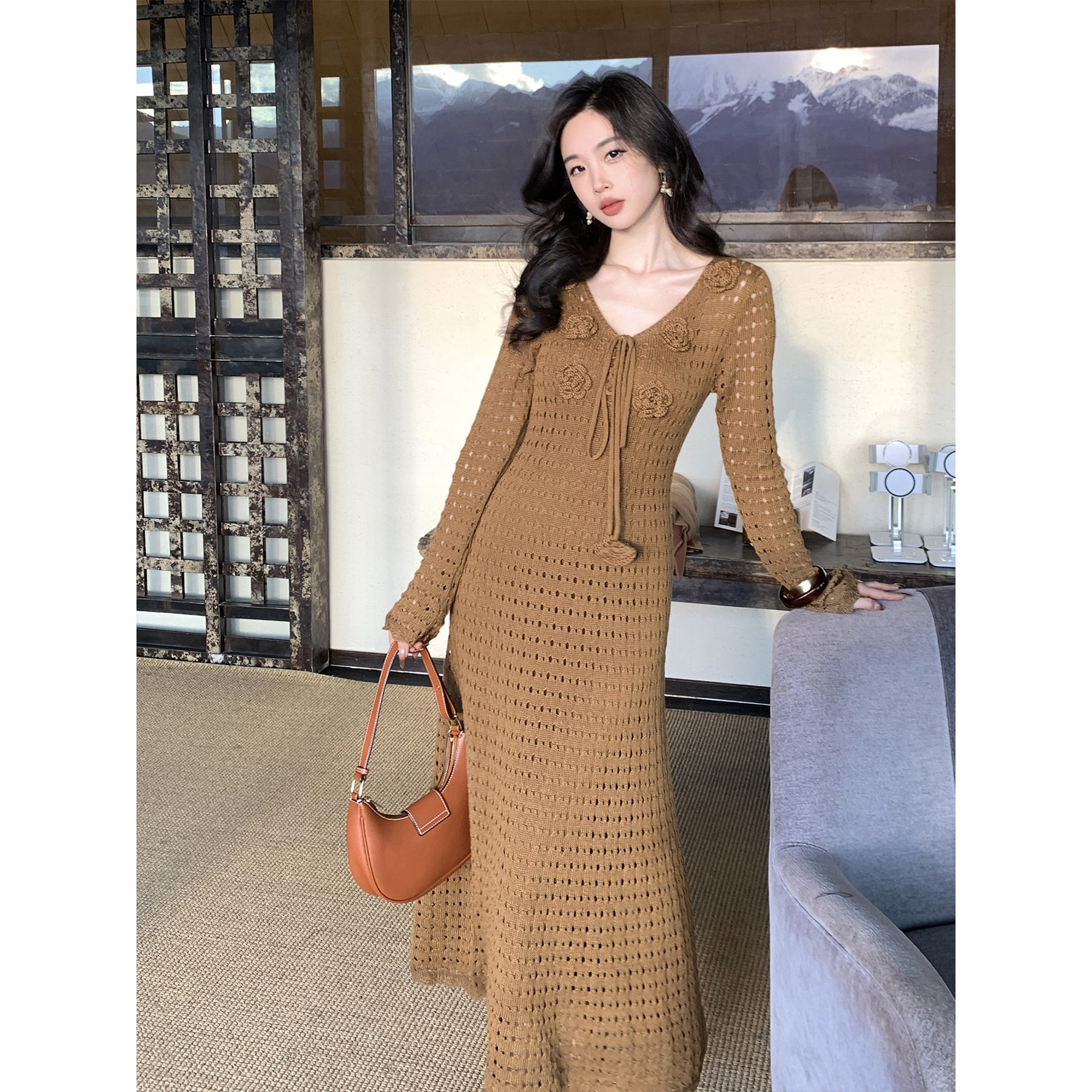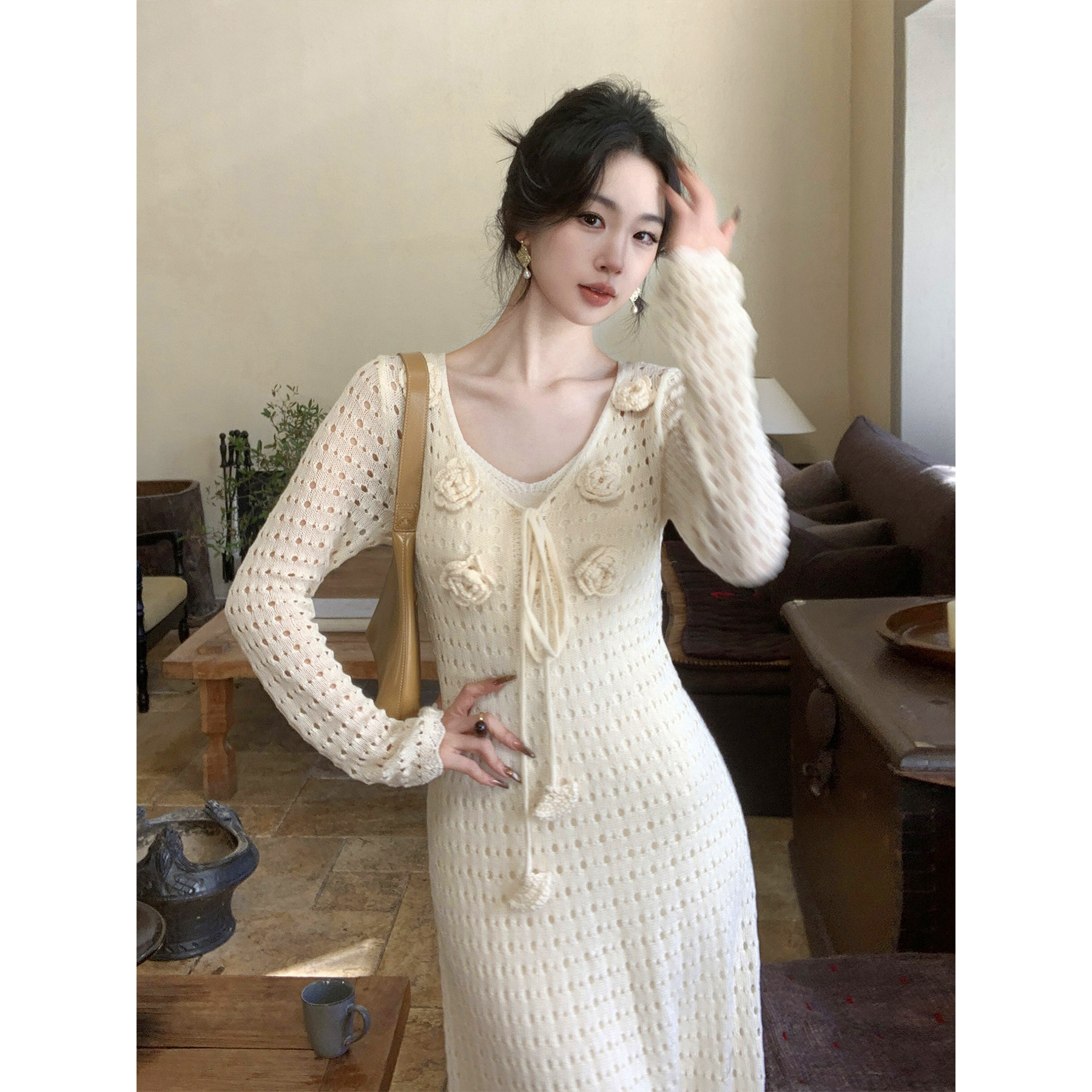 【檀烟】SYT自制 V领立体花朵针织长袖修身显瘦连衣裙两件套装裙