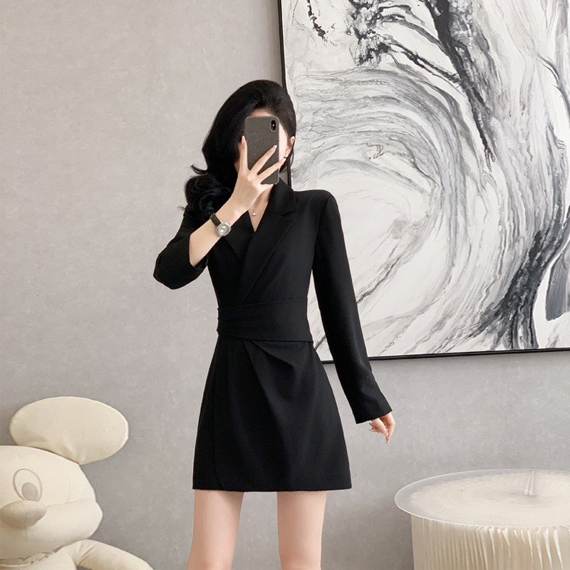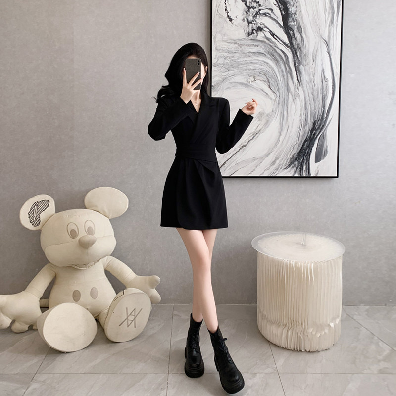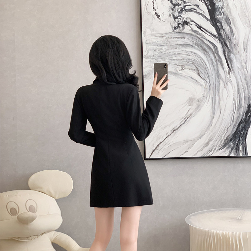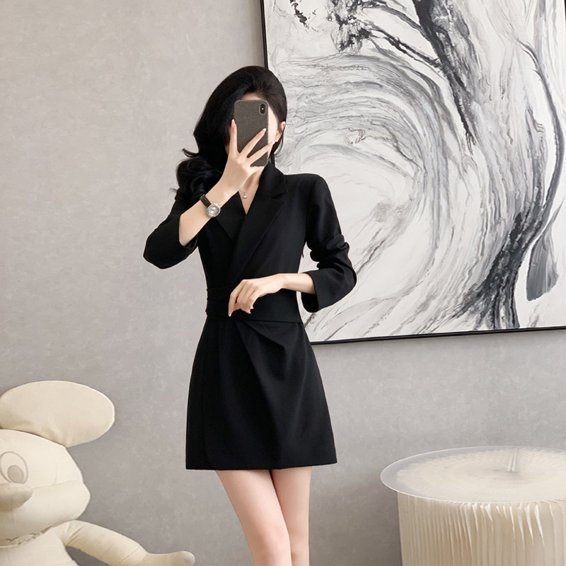 黑色长袖西装连衣裙女秋装新款女神范短款西服裙子收腰气质小黑裙