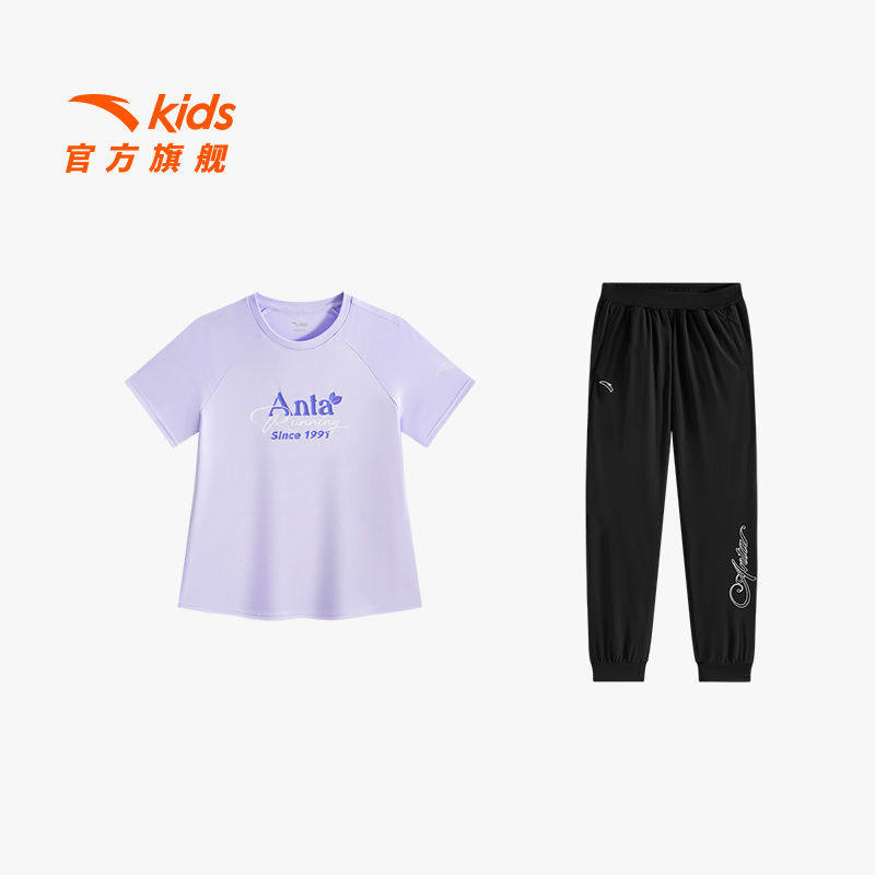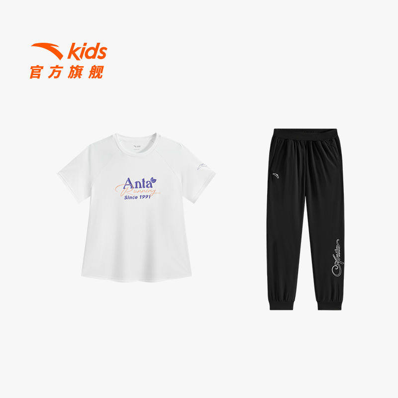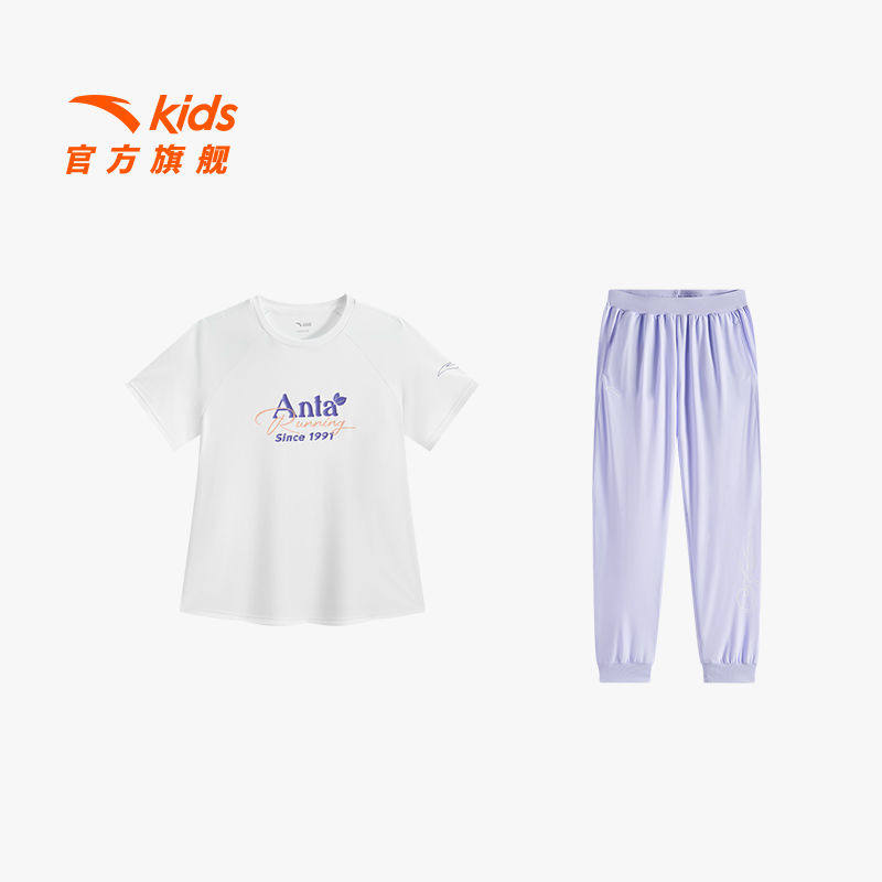 安踏儿童女童套装2026年夏季透气舒适运动两件套短T长裤套装
