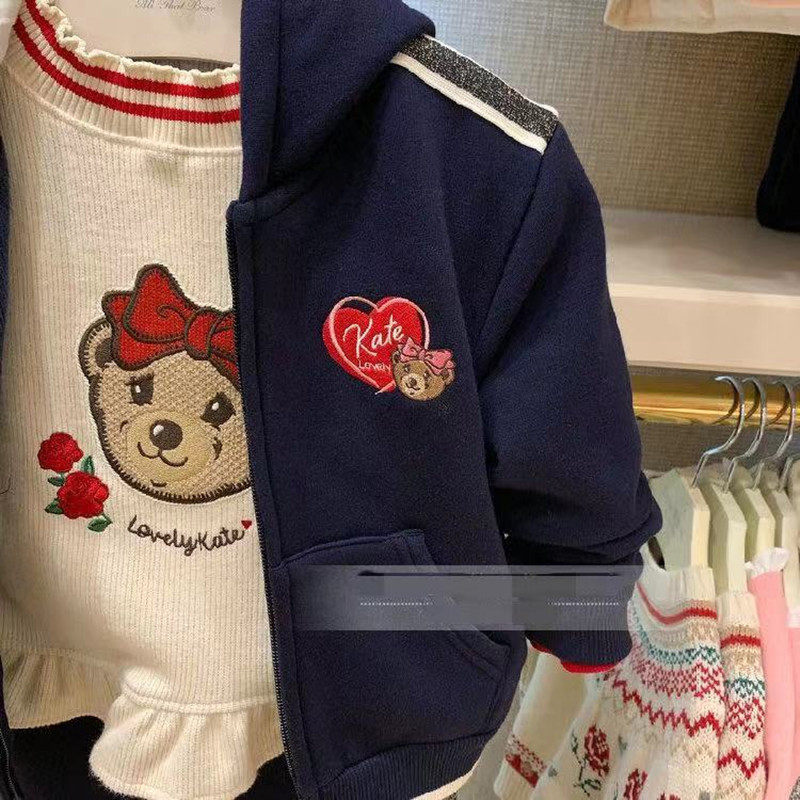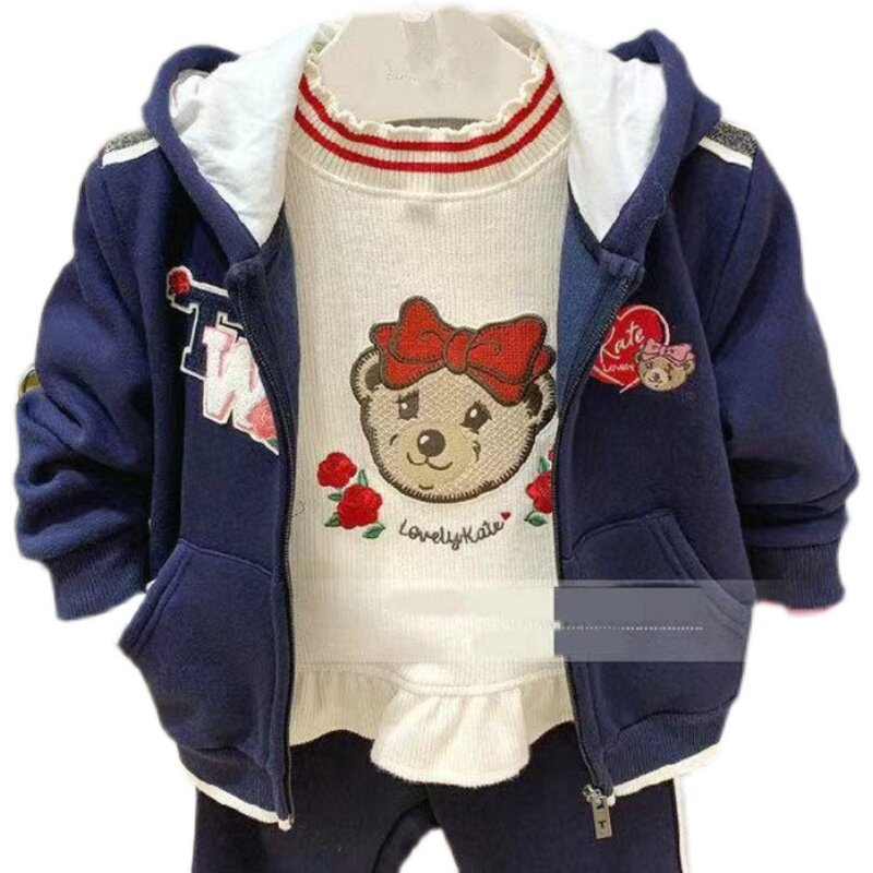女童加绒连帽外套不倒绒开衫卫衣秋冬新款套装韩版小熊童装洋气