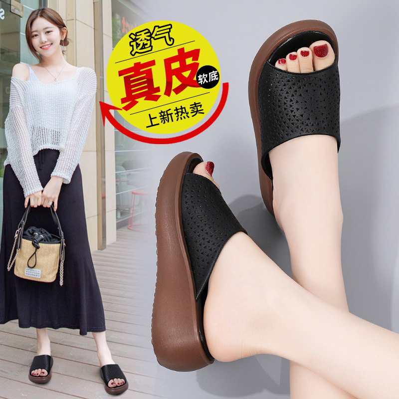 超火厚底凉拖鞋女夏外穿时尚高级感配裙子真皮小个子坡跟一字拖