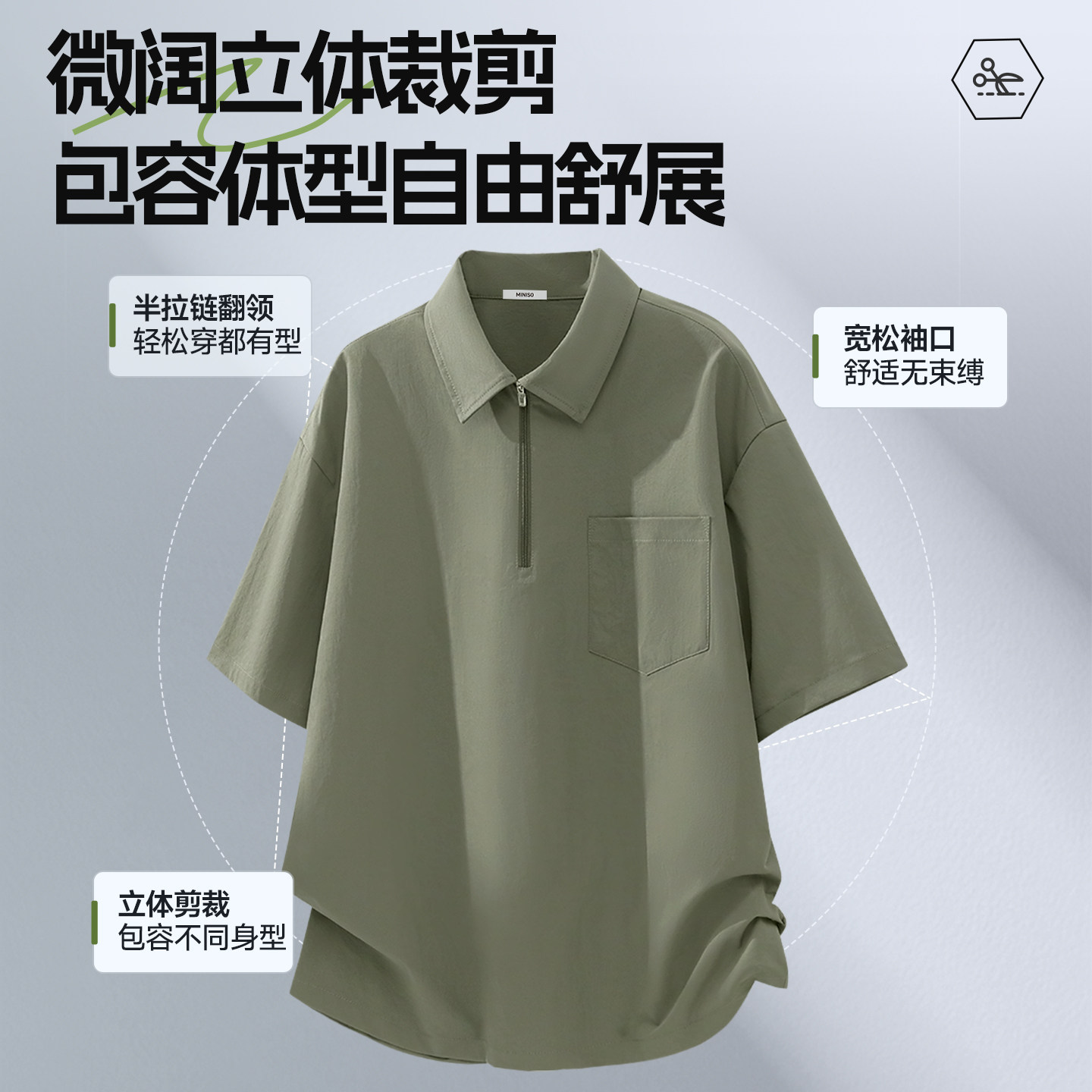 名创优品衬衫男款夏天正肩百搭半拉链上衣青少年休闲短袖衬衣男A