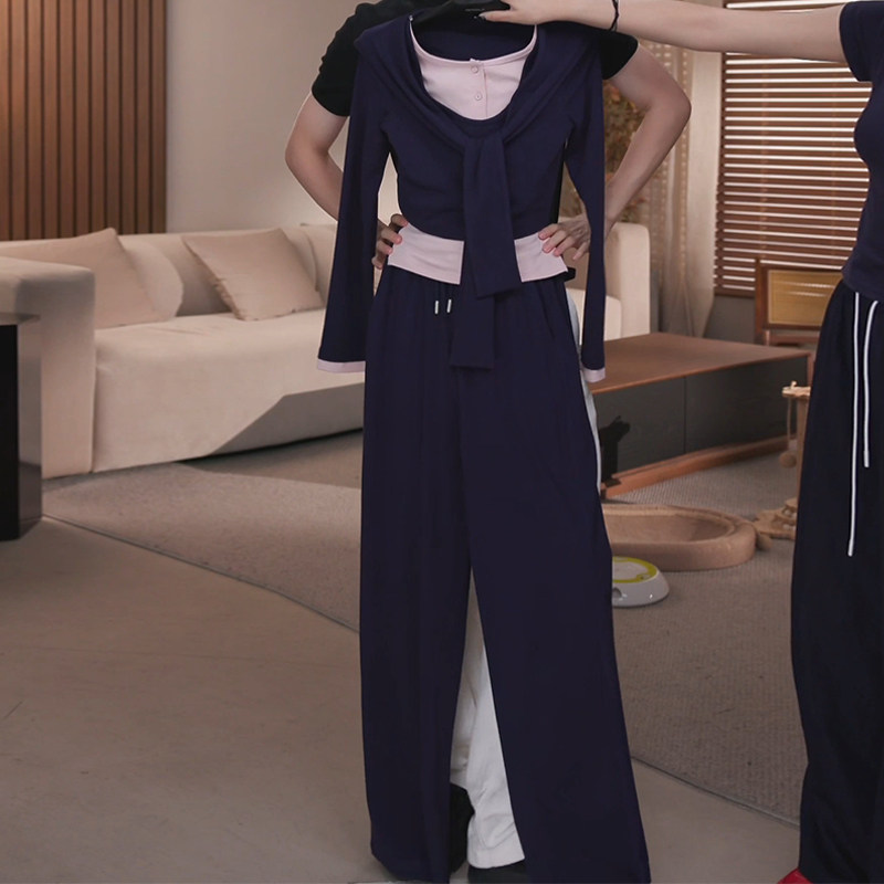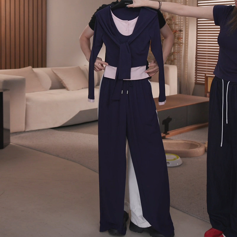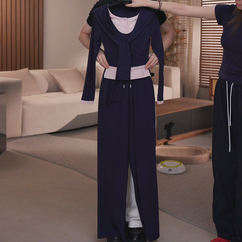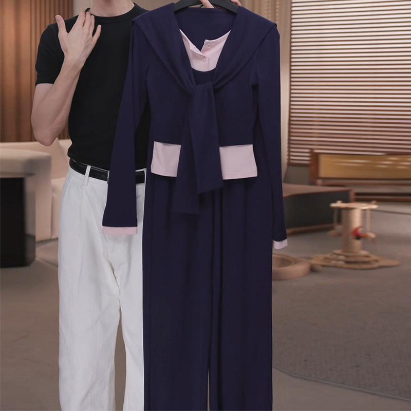 松弛感穿搭一整套2026早春新款假两件拼接海军翻盖领上衣裤子套装