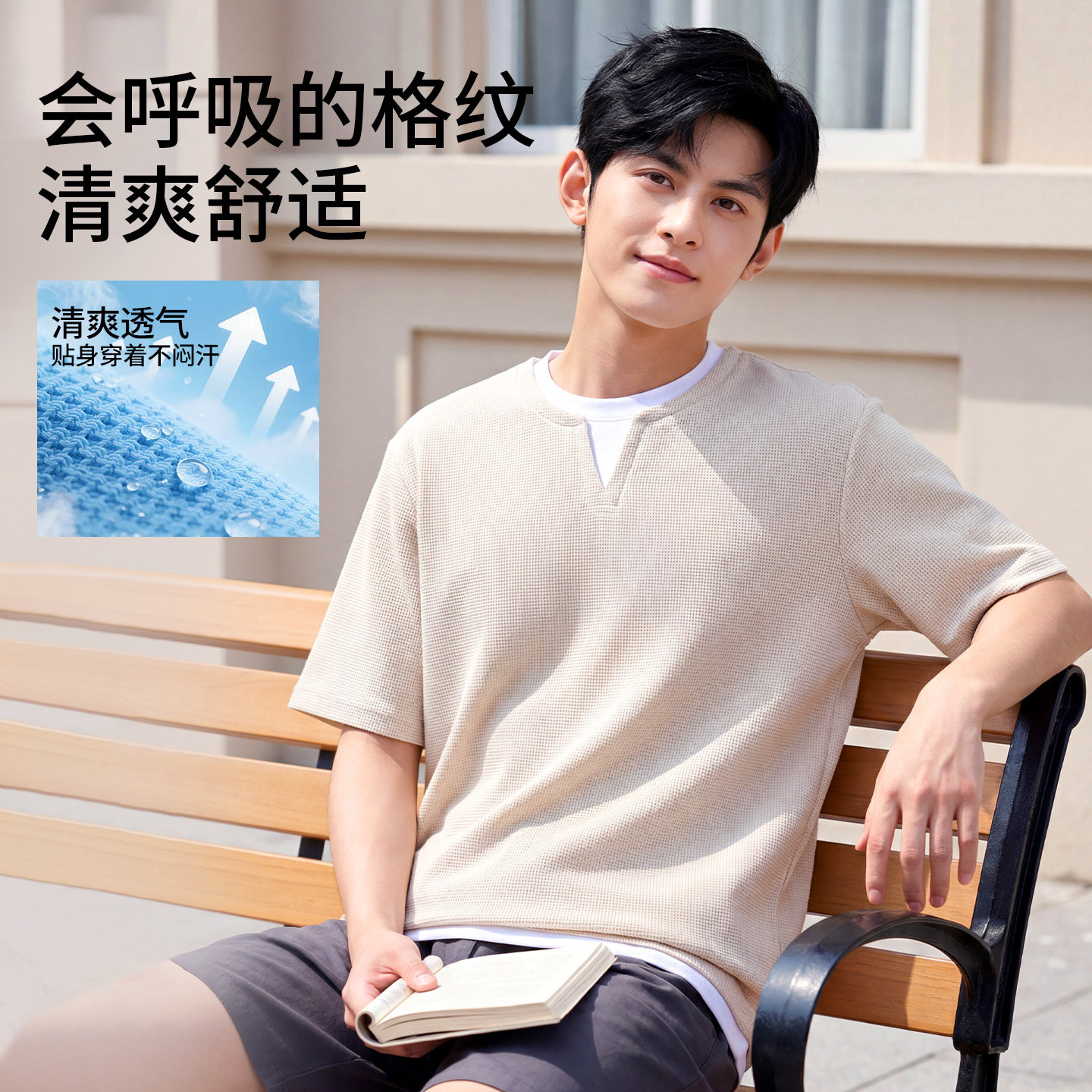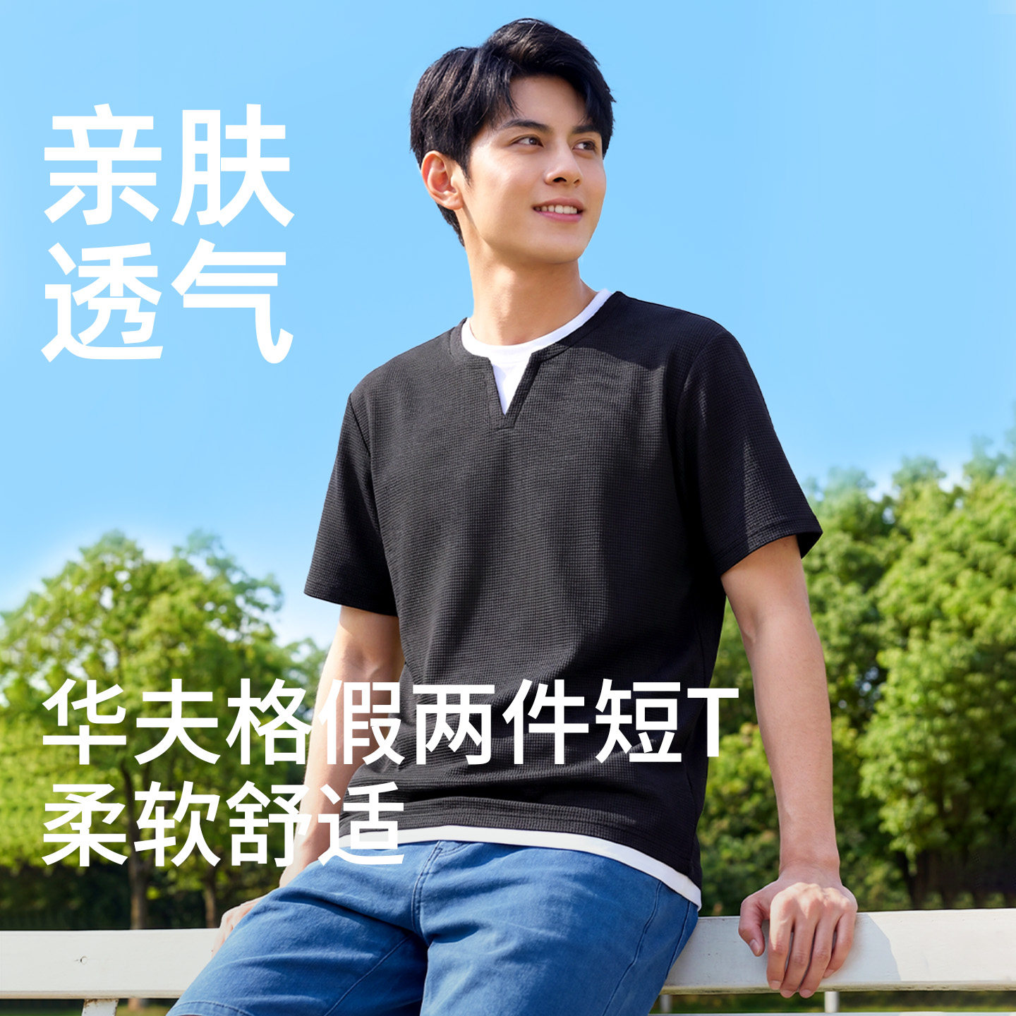 班尼路短袖男款夏季2026新款青少年黑色假两件拼接华格夫t恤男A