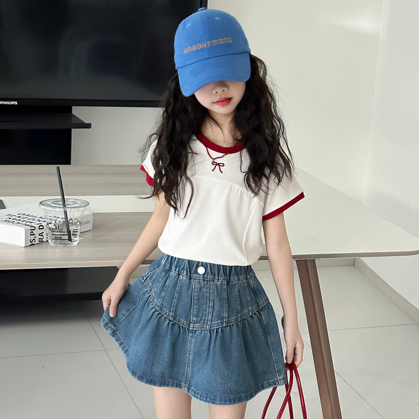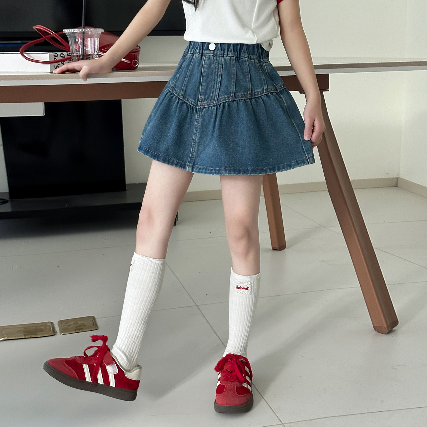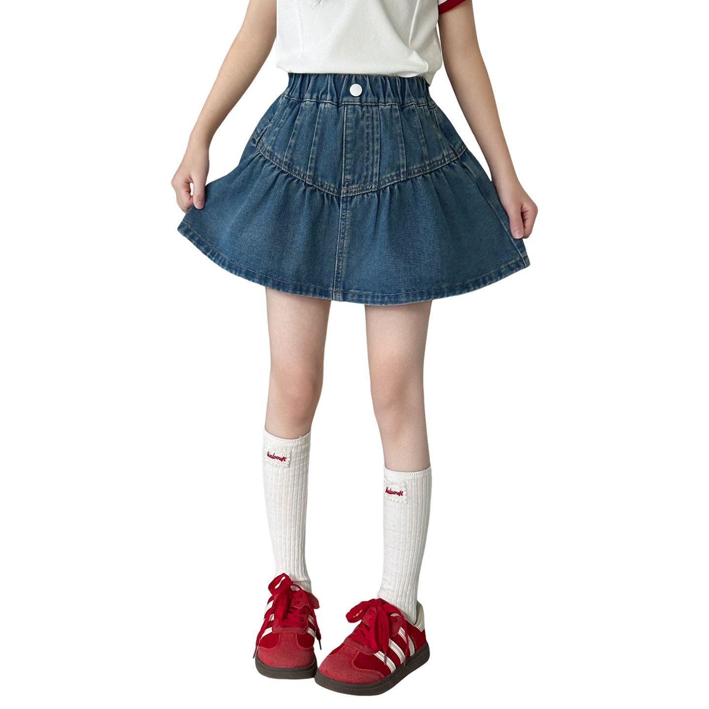 女童牛仔短裙夏季韩版A字荷叶边百搭半身裙洋气女孩防走光短裙子
