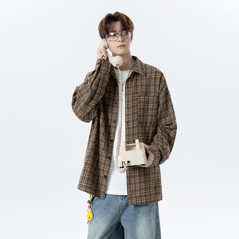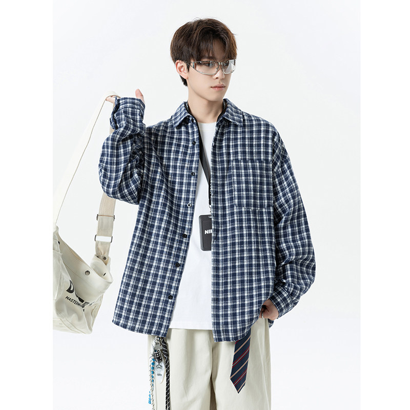 2026春季新款男士棉质长袖衬衫休闲格子衬衣春装上衣男款薄款外套