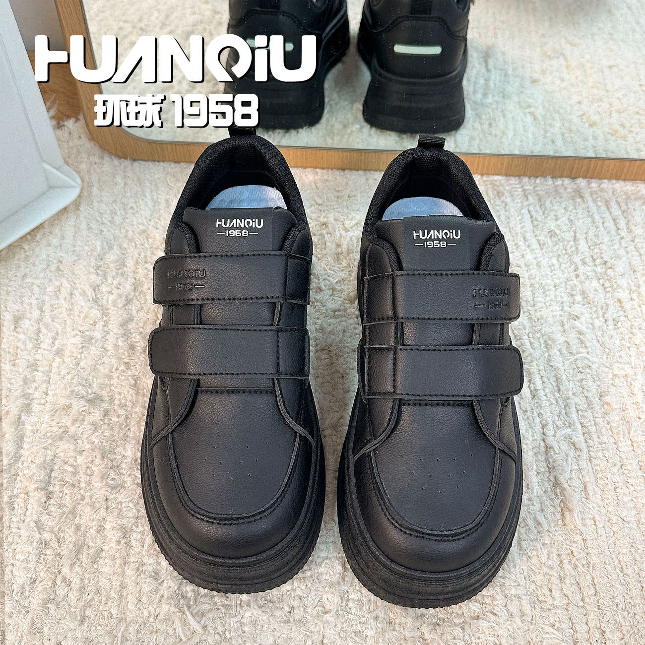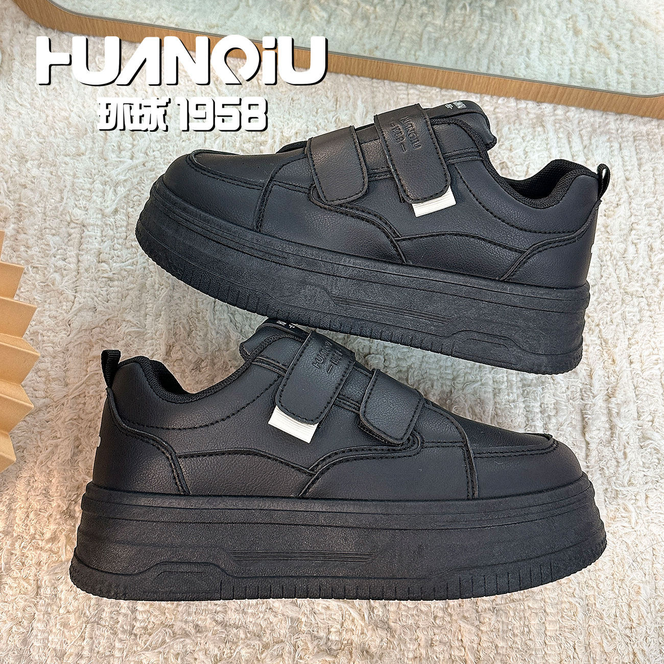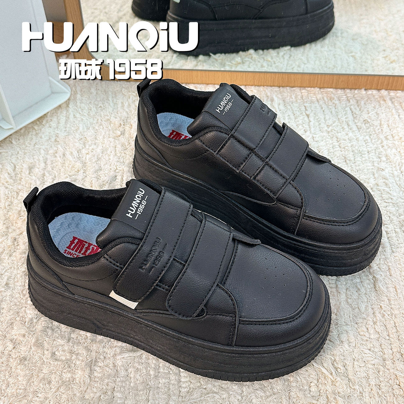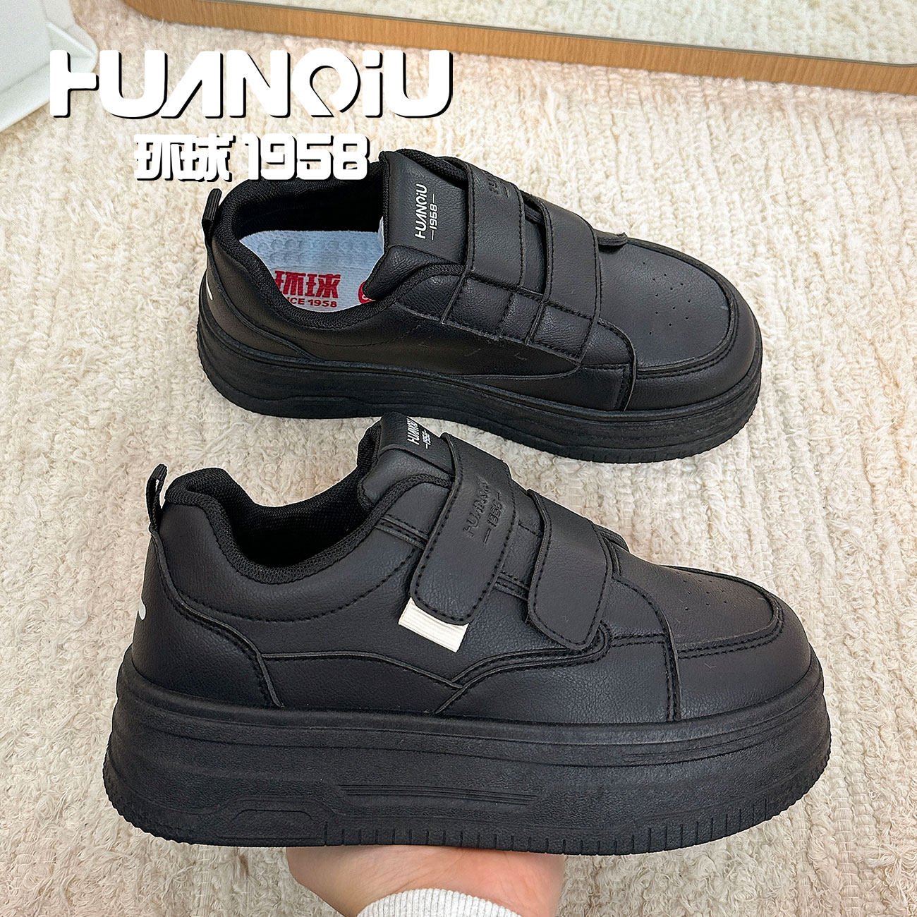 环球黑色魔术贴厚底面包鞋女2026新款春季学生百搭休闲轻便板鞋潮