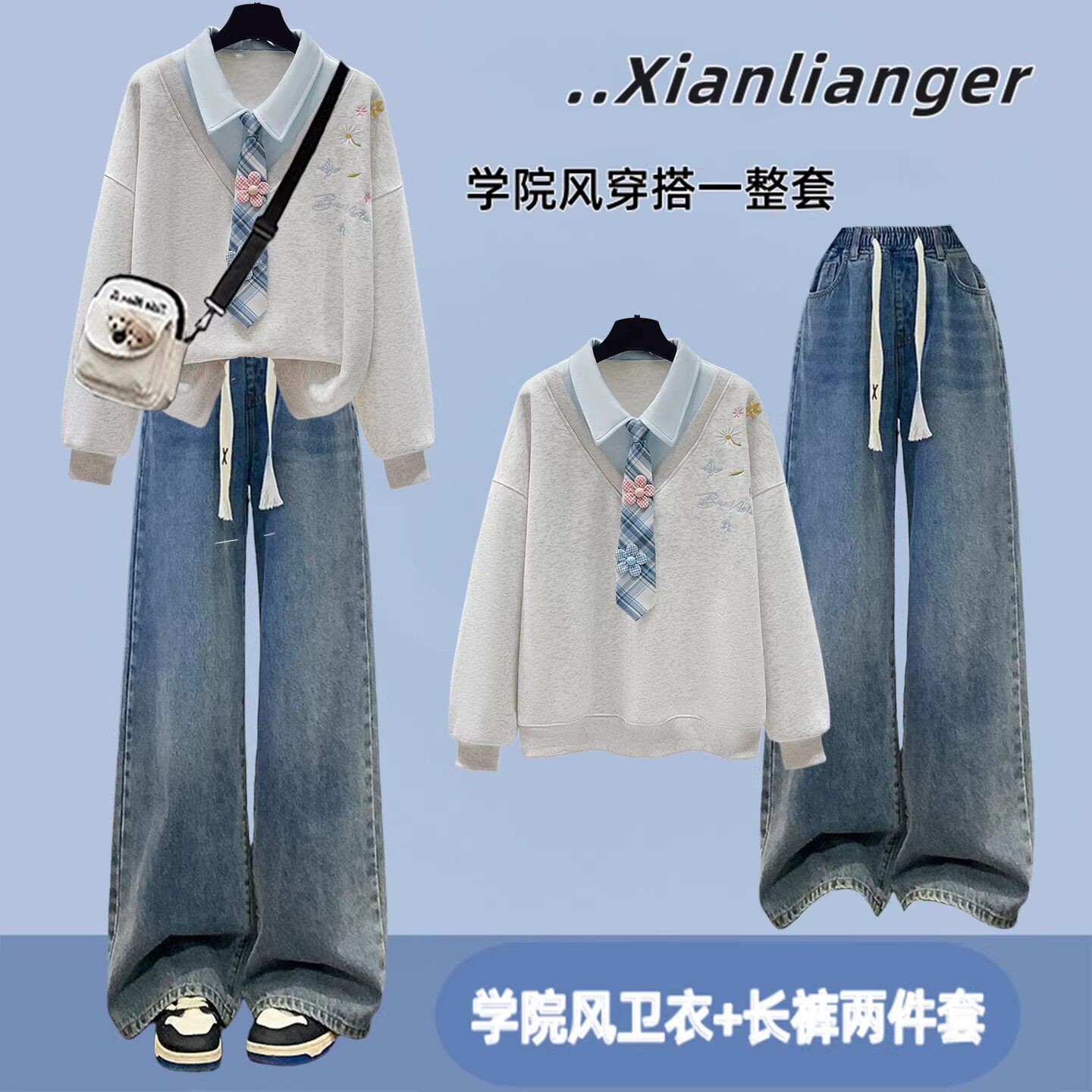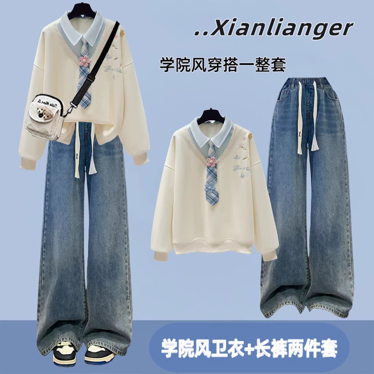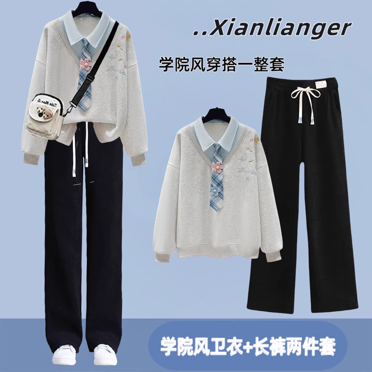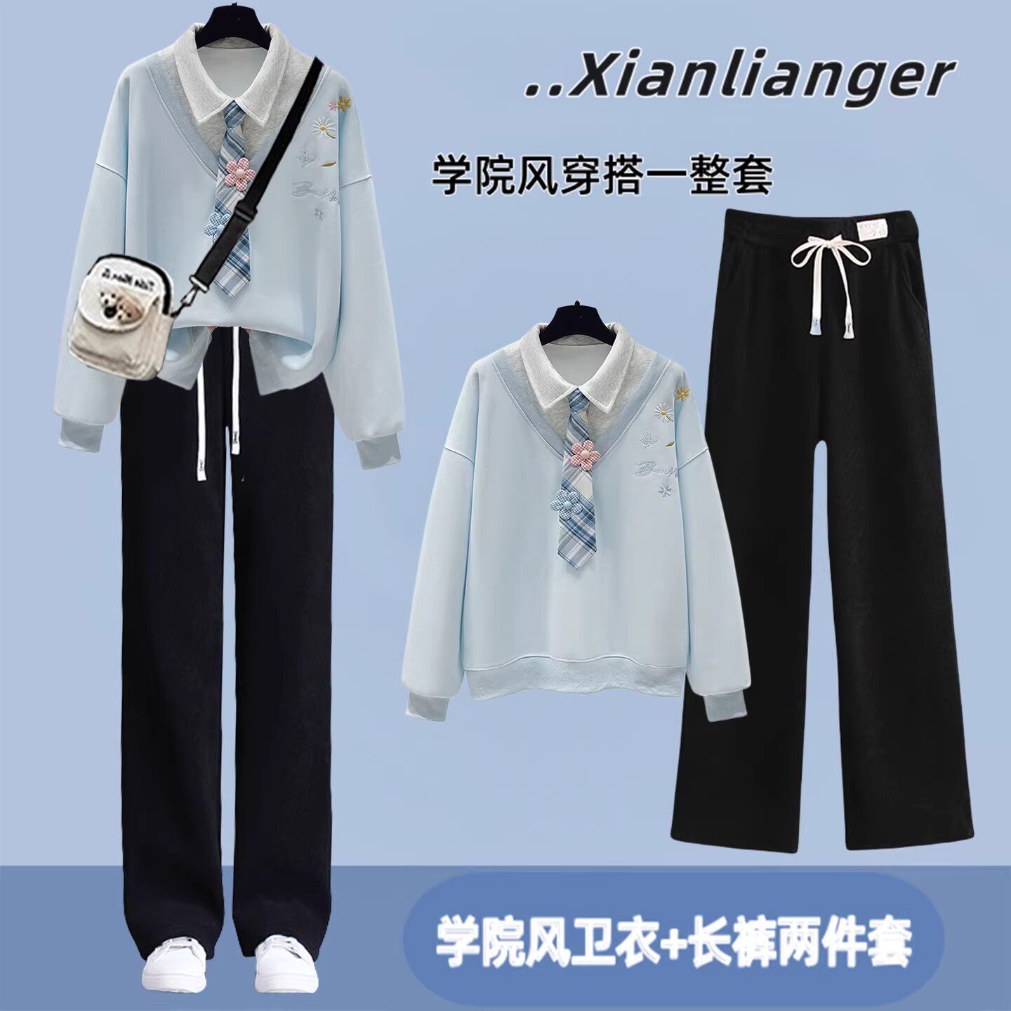 初中生春装女套装学院风少女假两件卫衣青少年学生休闲运动两件套