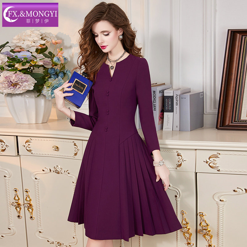 菲梦伊紫色连衣裙女长袖春装新款高端优雅简约气质修身A字中长裙