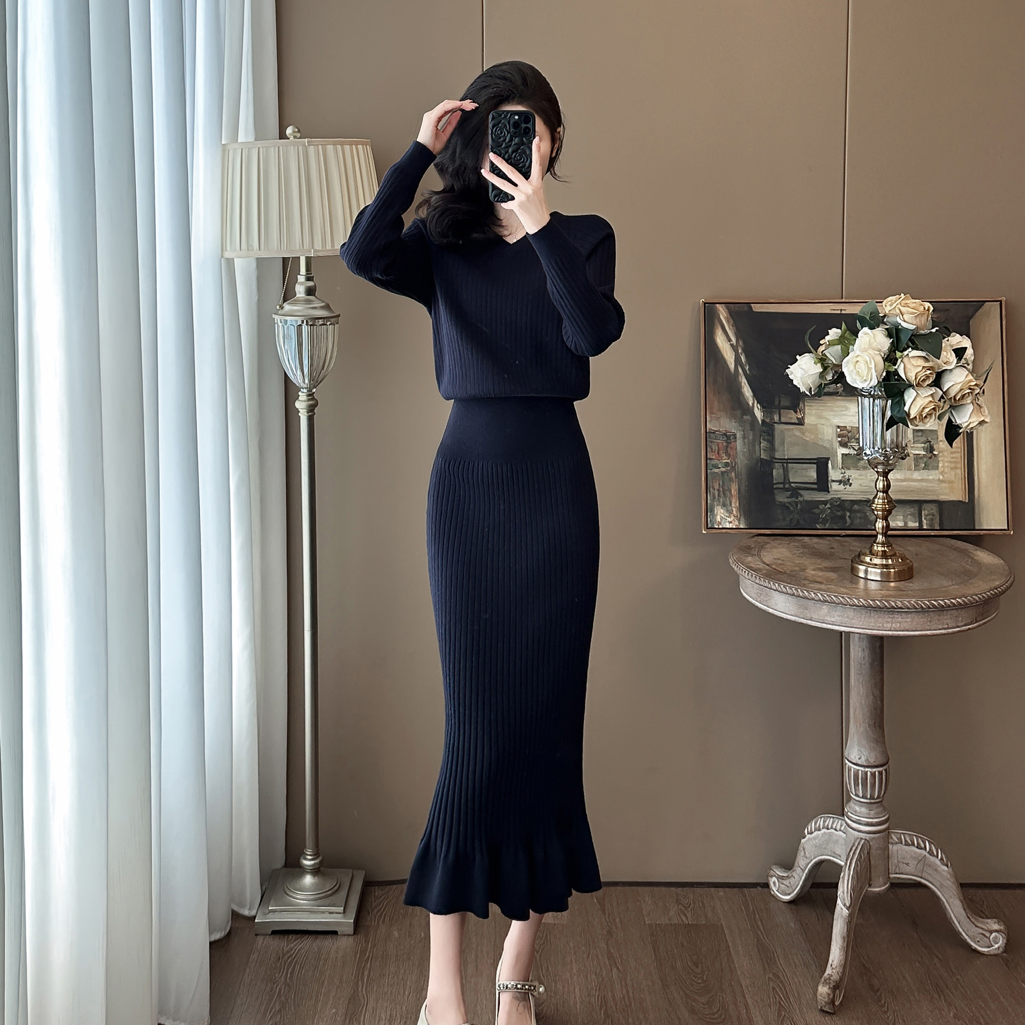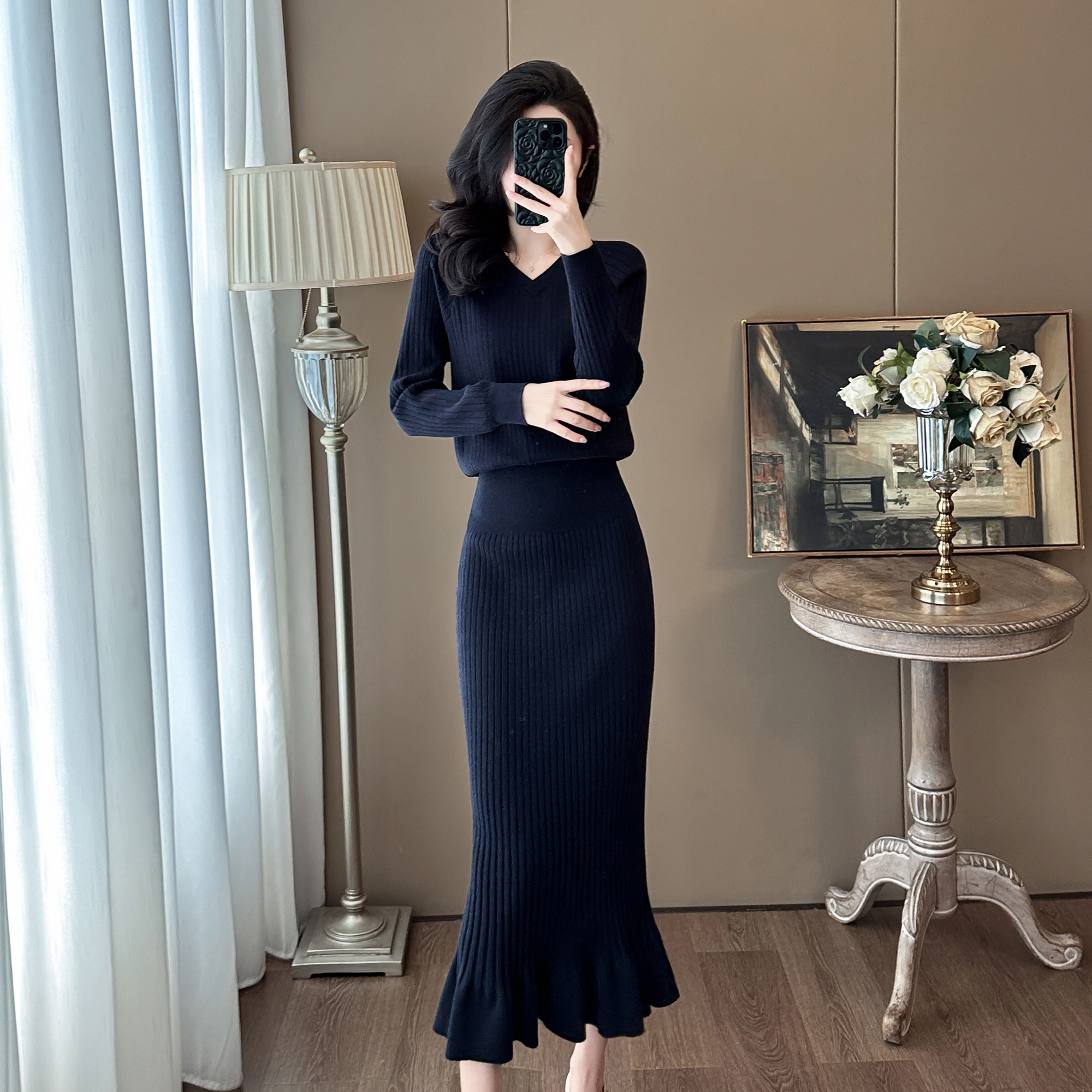 极简风针织连衣裙女长袖修身显瘦包臀鱼尾裙气质通勤2026新款春装