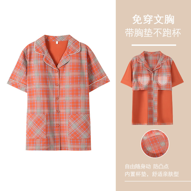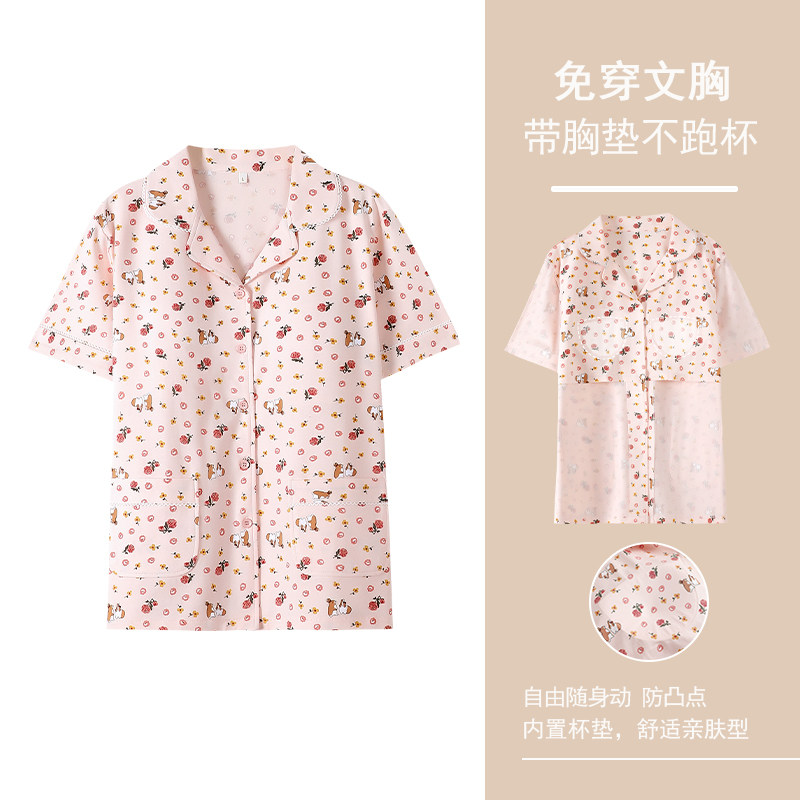 女士带胸垫夏季短袖睡衣夏天纯棉女款开衫上衣单件t恤家居服单衣