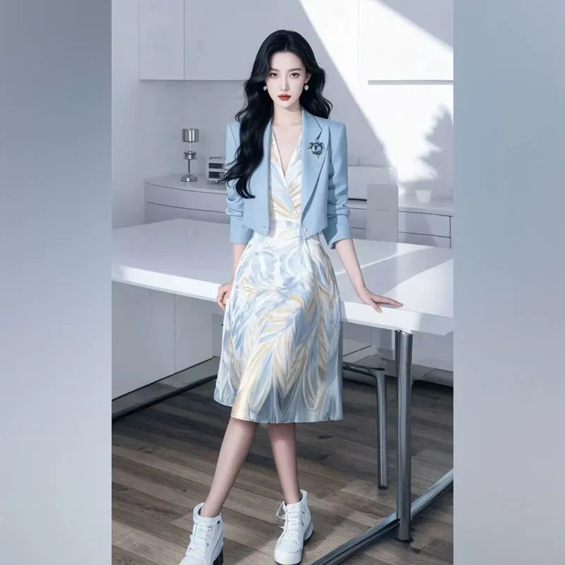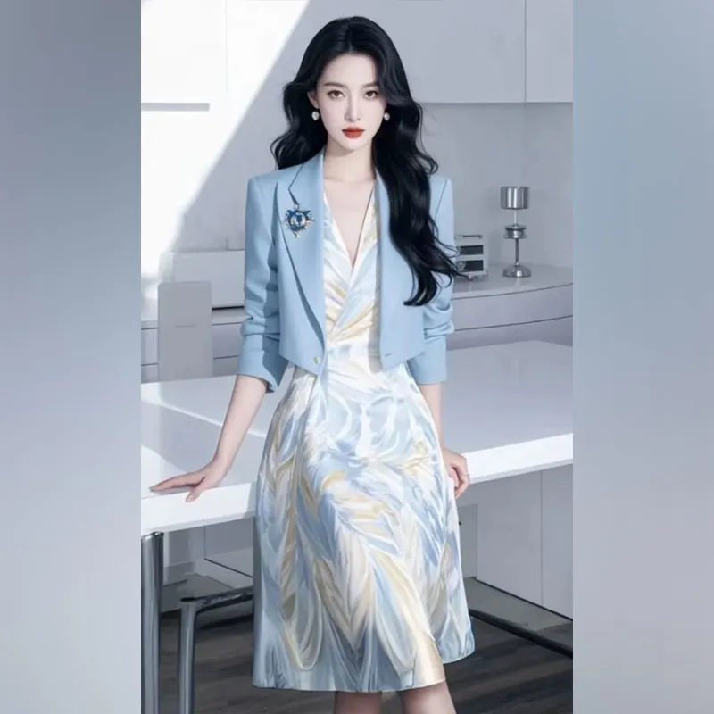 2026春装新款轻奢高级感女人味气质小香风蓝色西装外套连衣裙套装