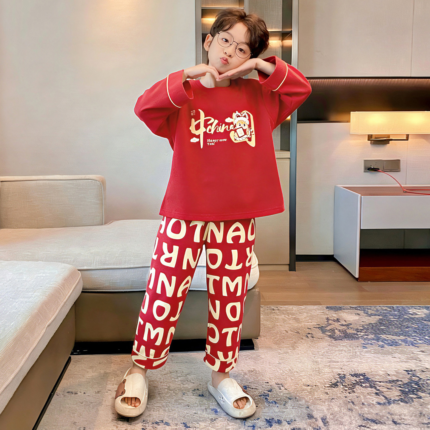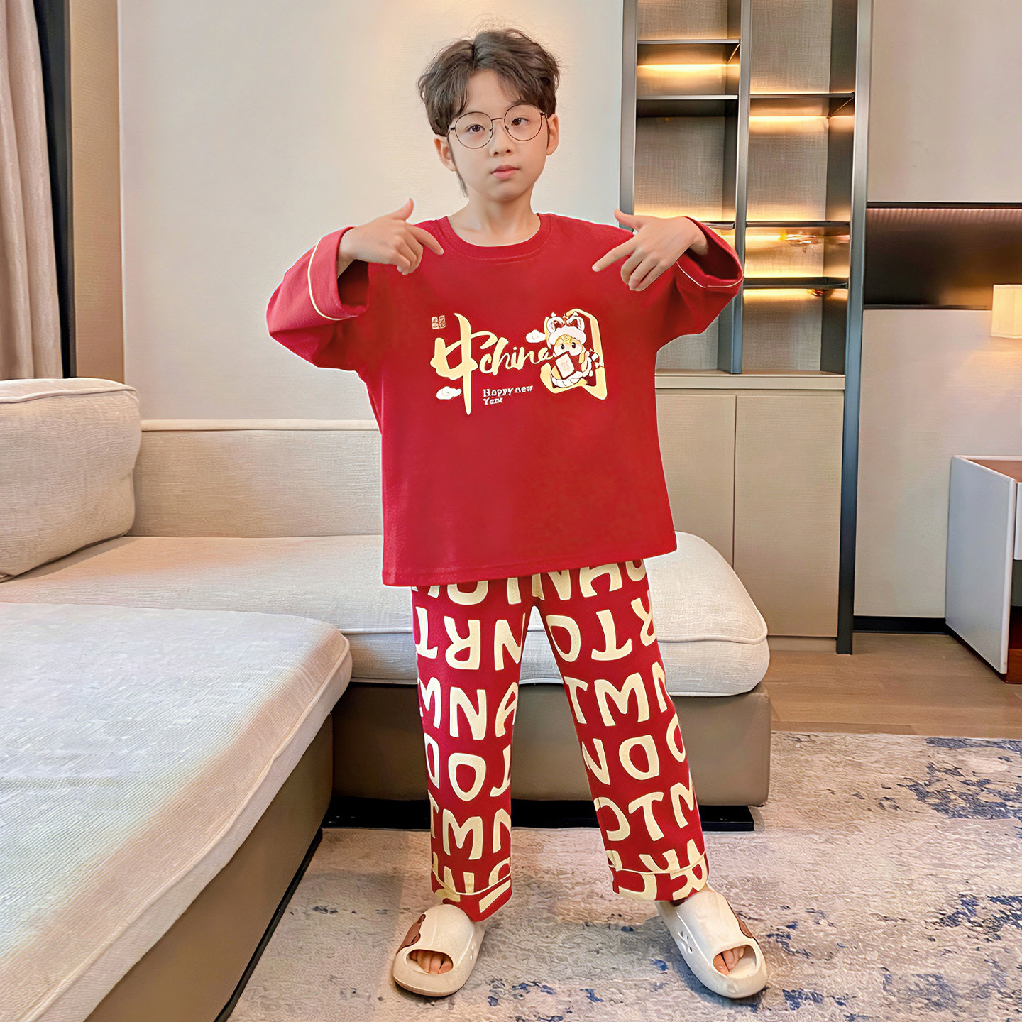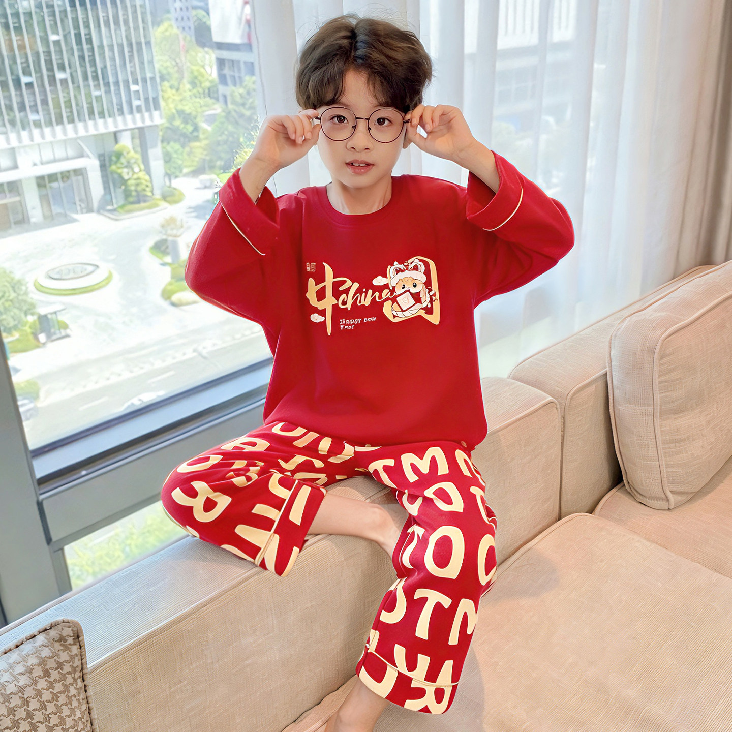 男童纯棉睡衣红色春秋季中大童儿童本命年家居服新年2026新款套装
