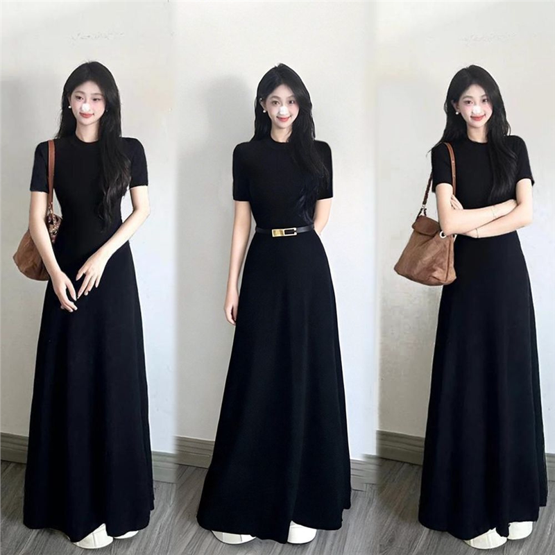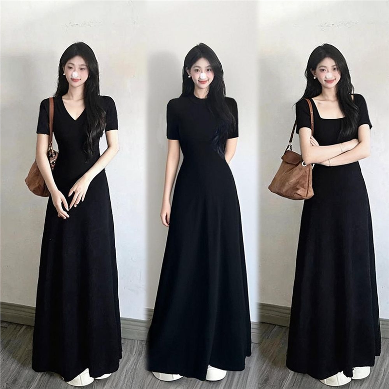 棉高品质2026春夏韩风V领短袖女连衣裙气质黑色辣妹修身内搭裙子