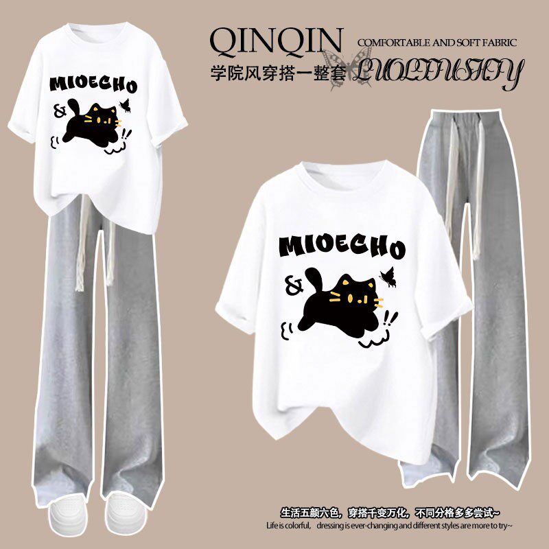 女童纯棉短袖T恤套装夏季新款卡通小猫印花中大童休闲长裤两件套