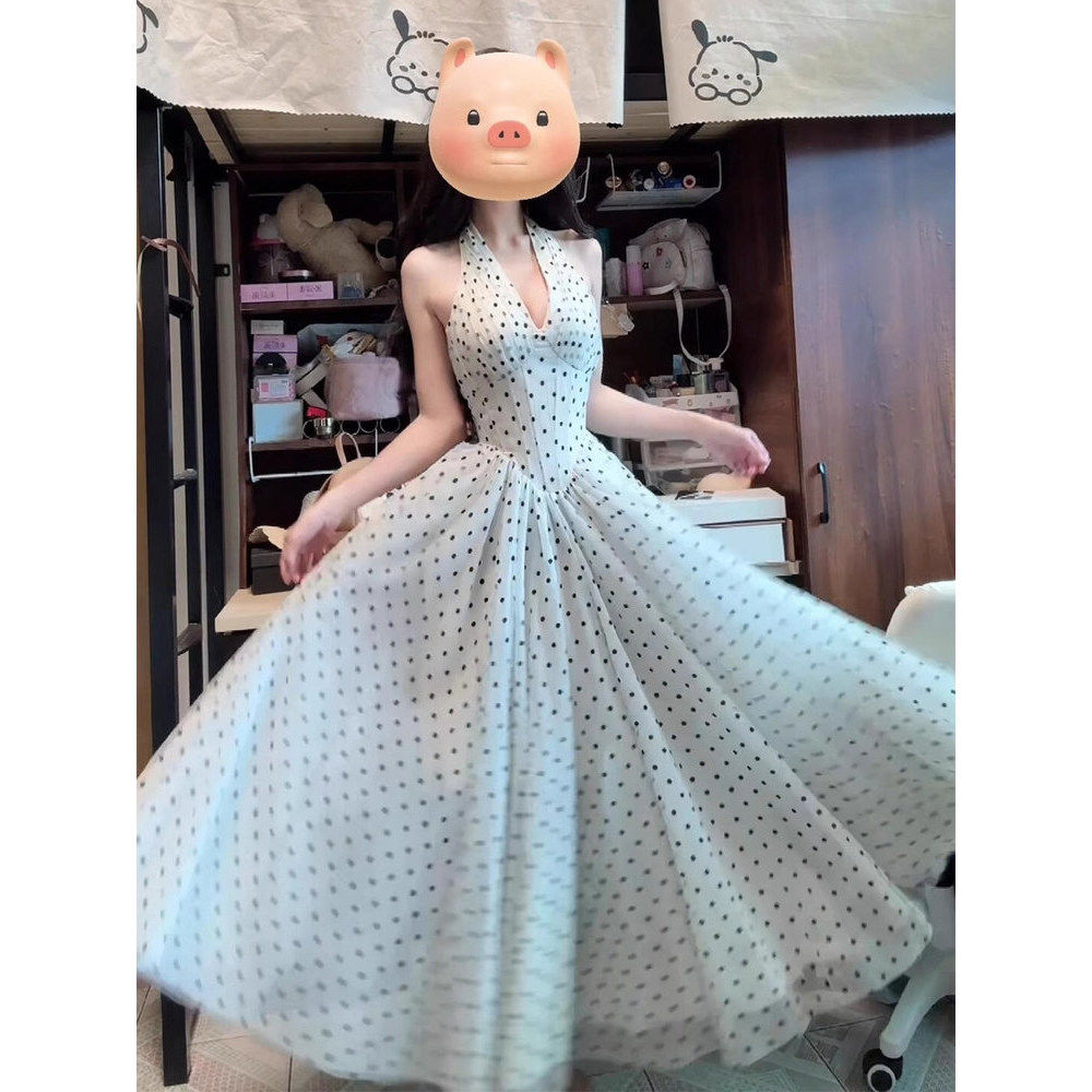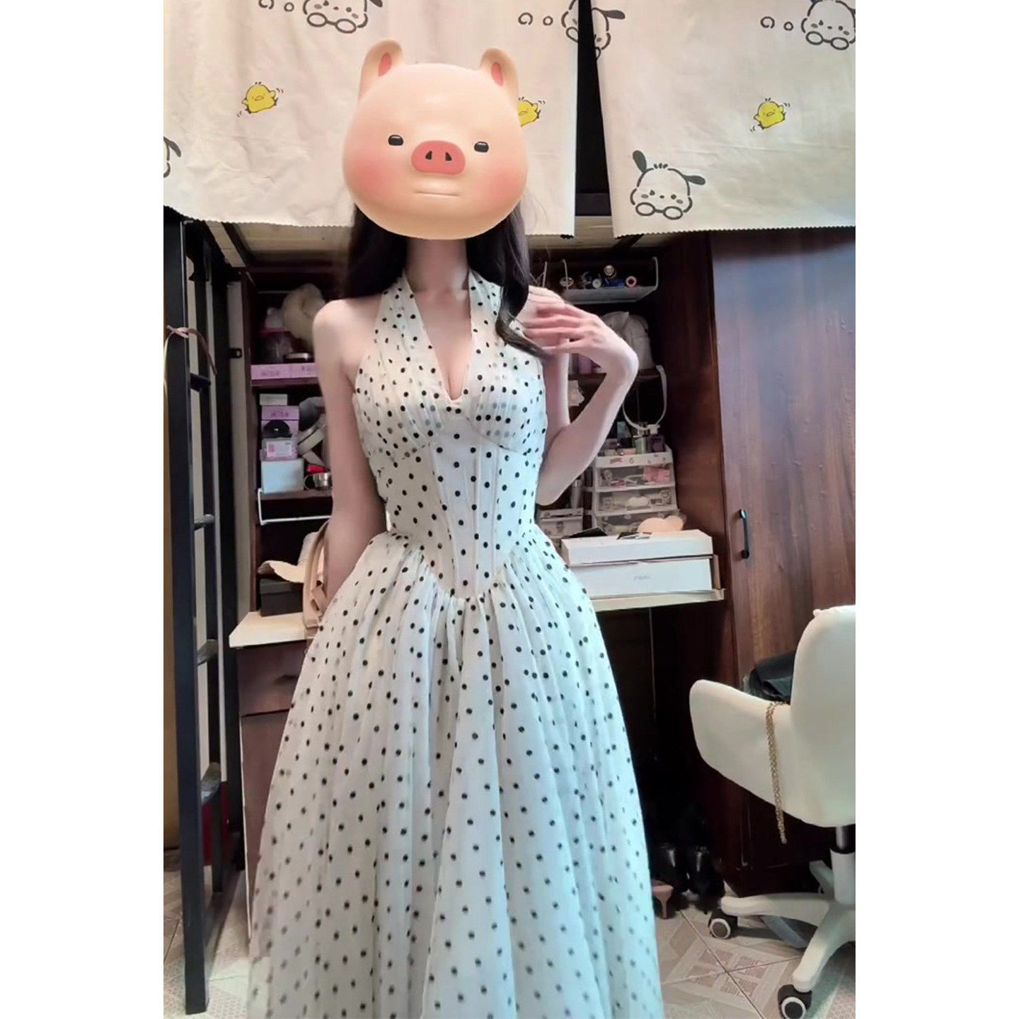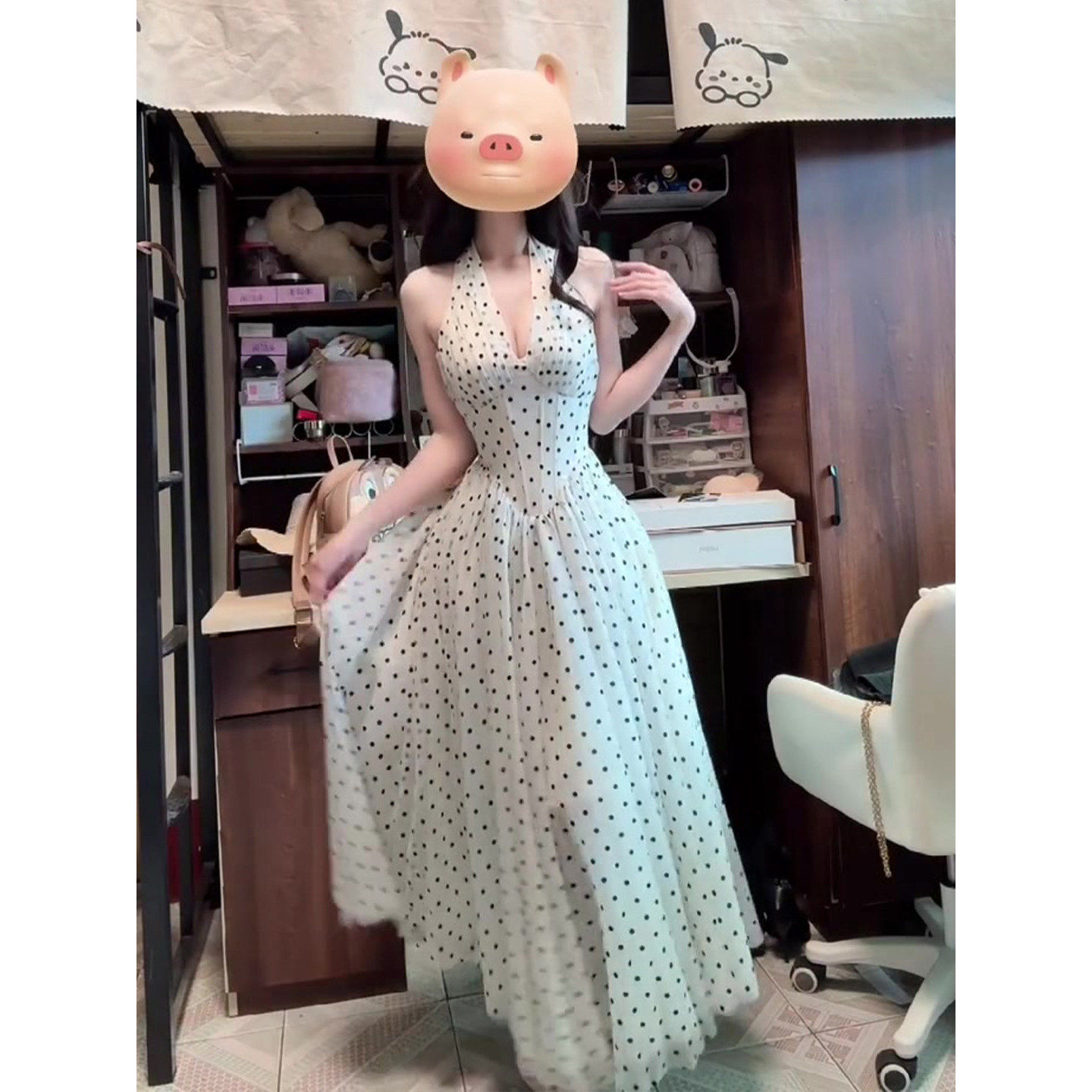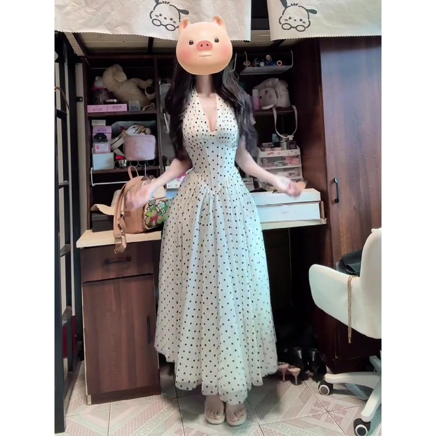 大码胖MM法式高级感气质波点挂脖连衣裙女夏季新款度假风绝美长裙