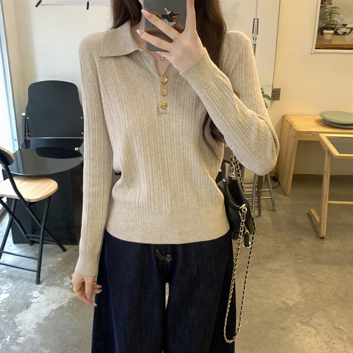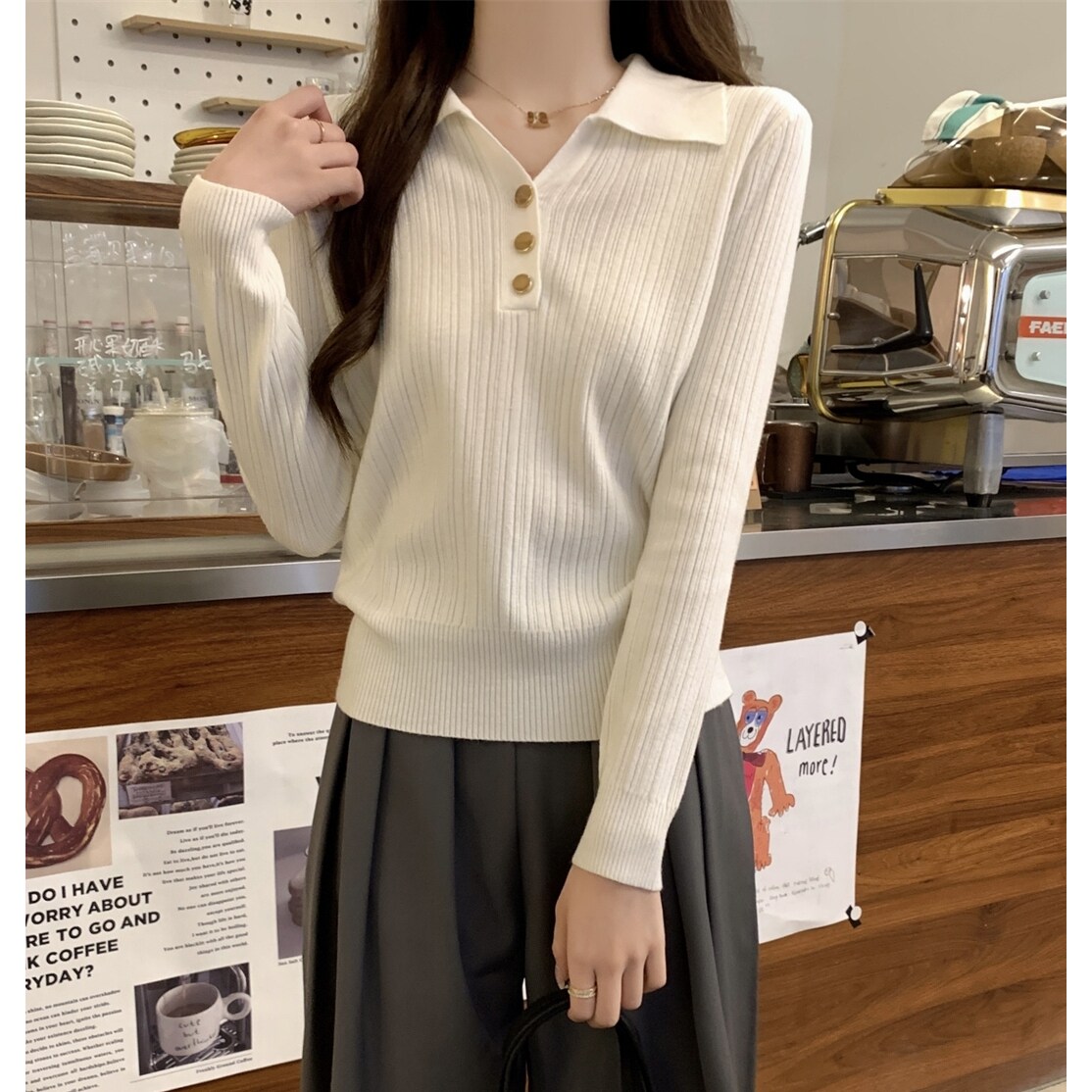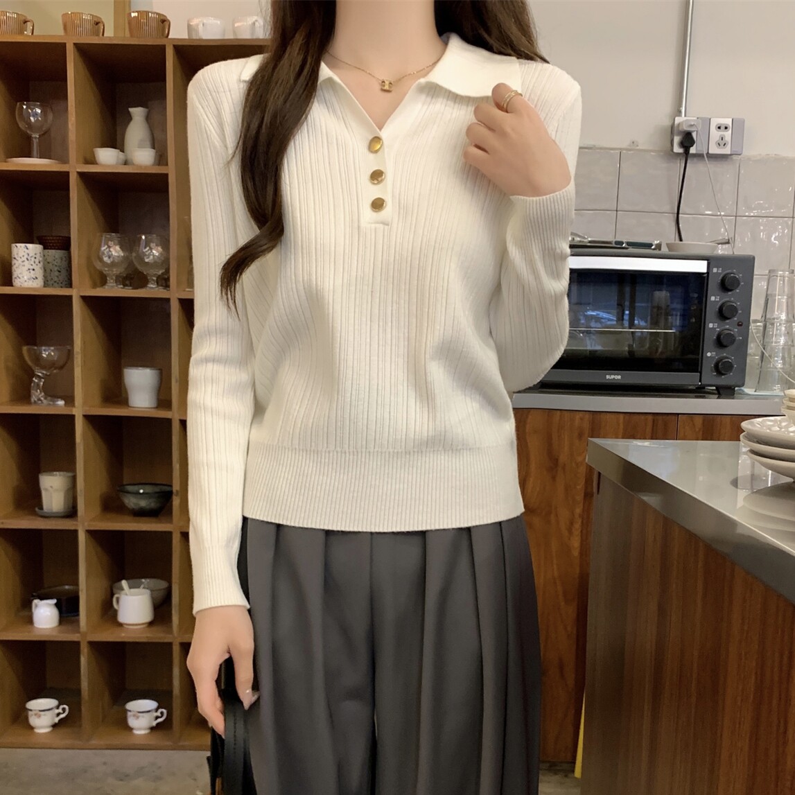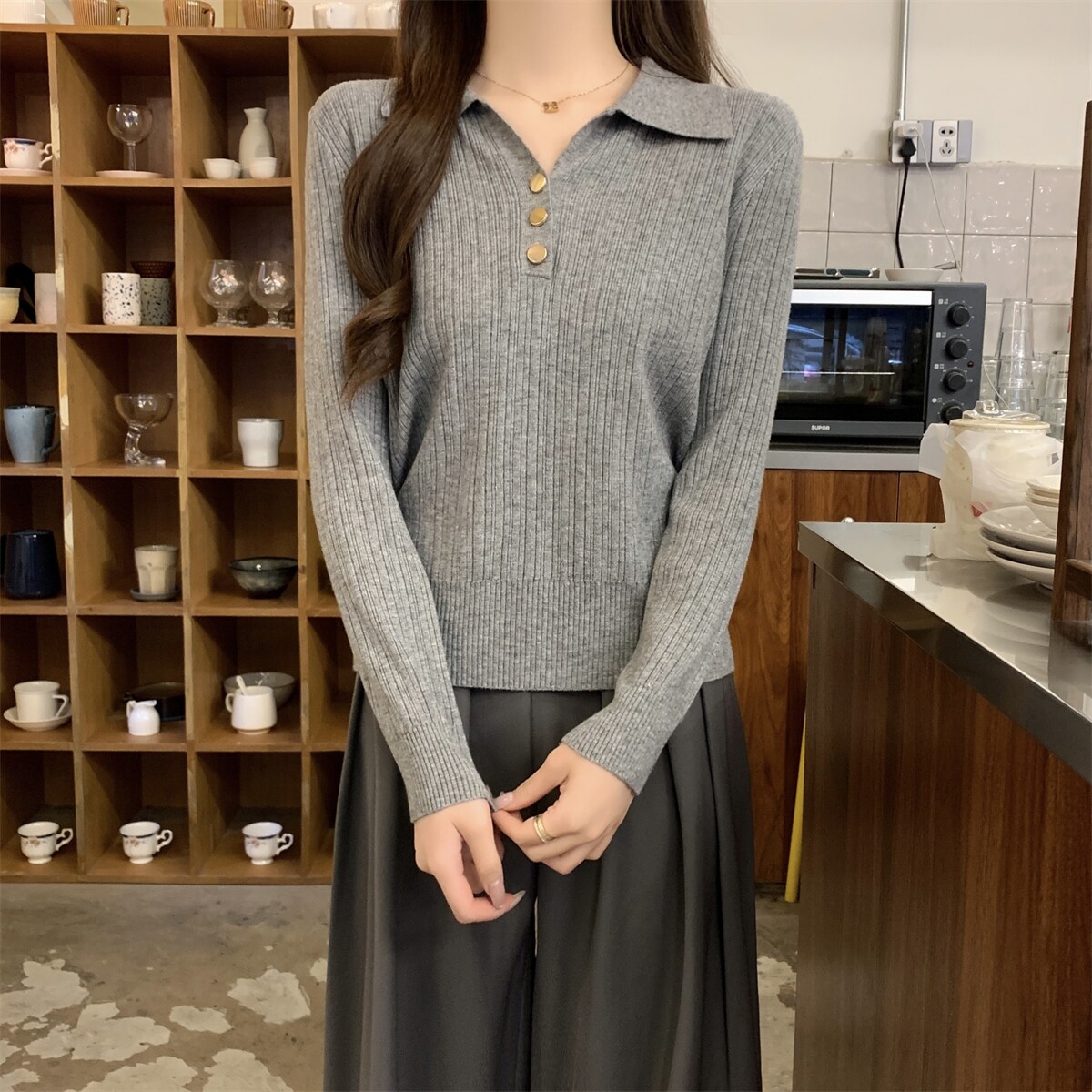 通勤风Polo翻领纽扣针织上衣女2026春季新款正肩坑条长袖打底毛衣