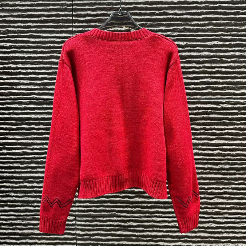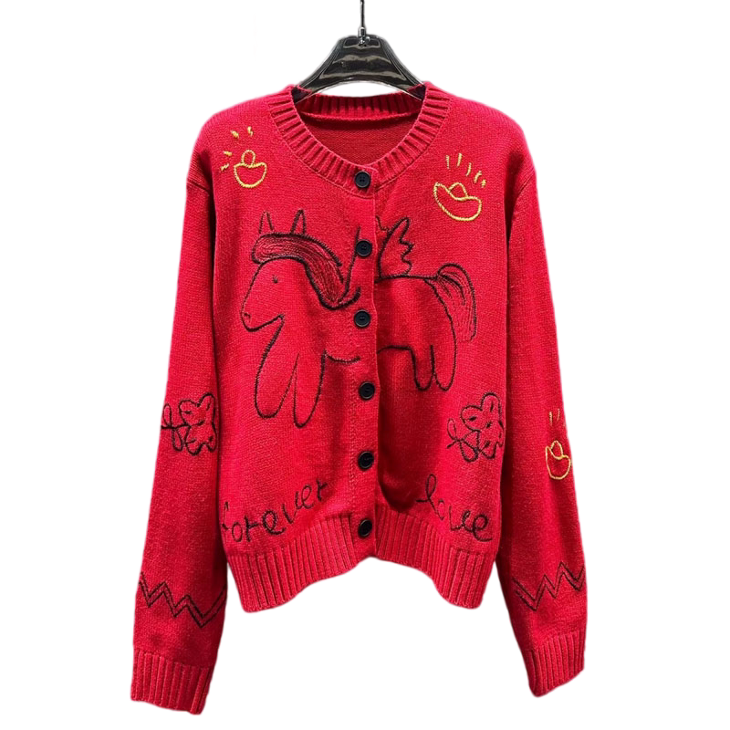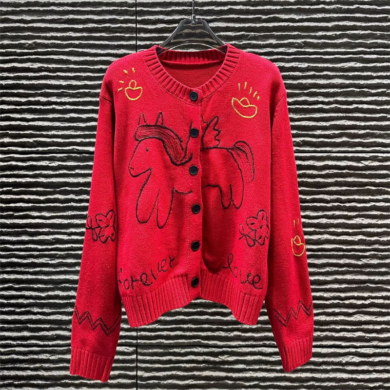 红色飞马字母刺绣针织开衫女26新年春节氛围感多纽扣毛衣外套上衣