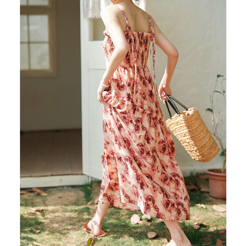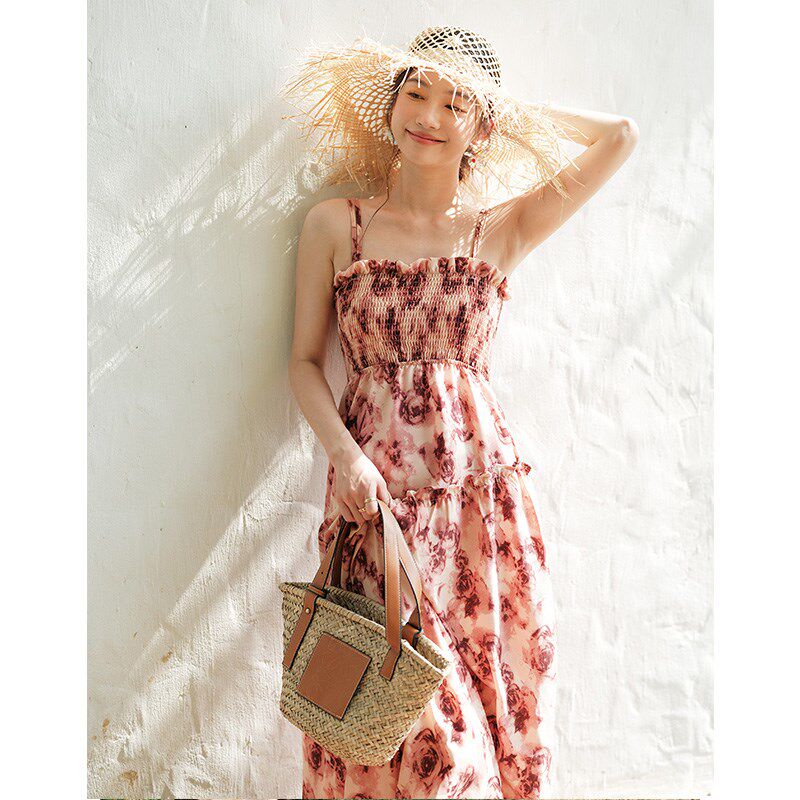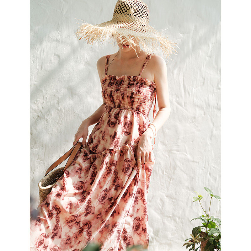 法式复古玫瑰吊带连衣裙夏季海边沙滩裙修身显瘦中长款碎花吊带裙