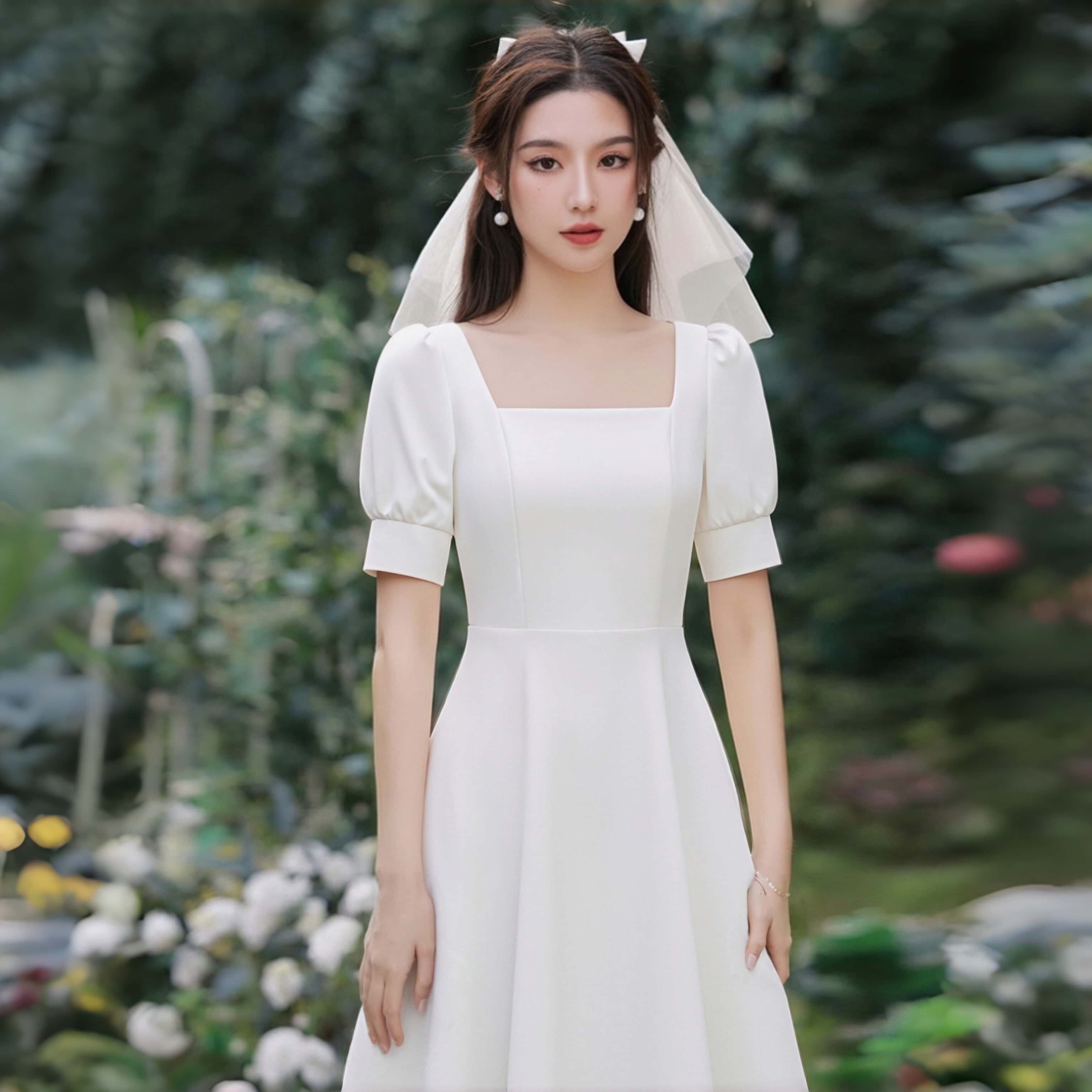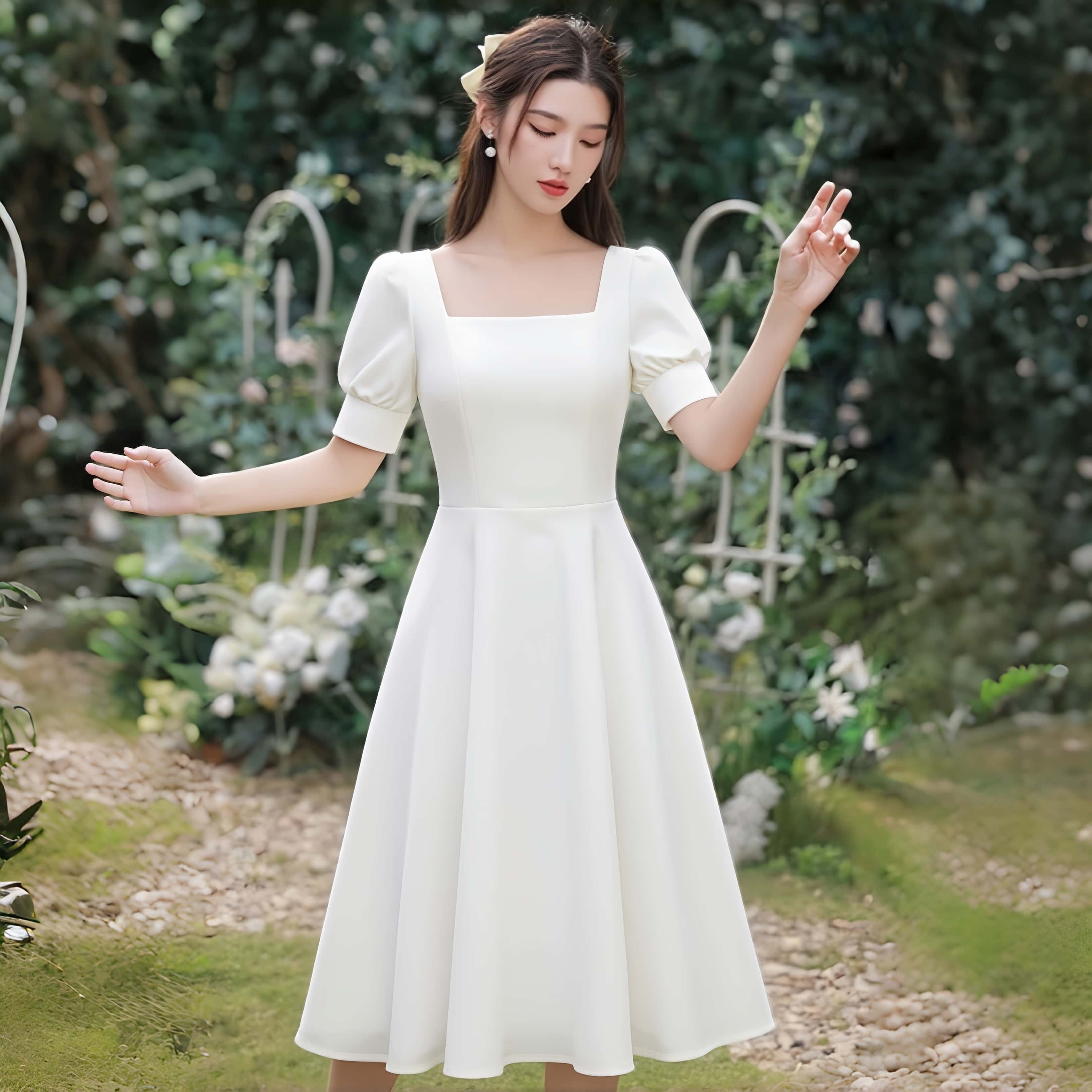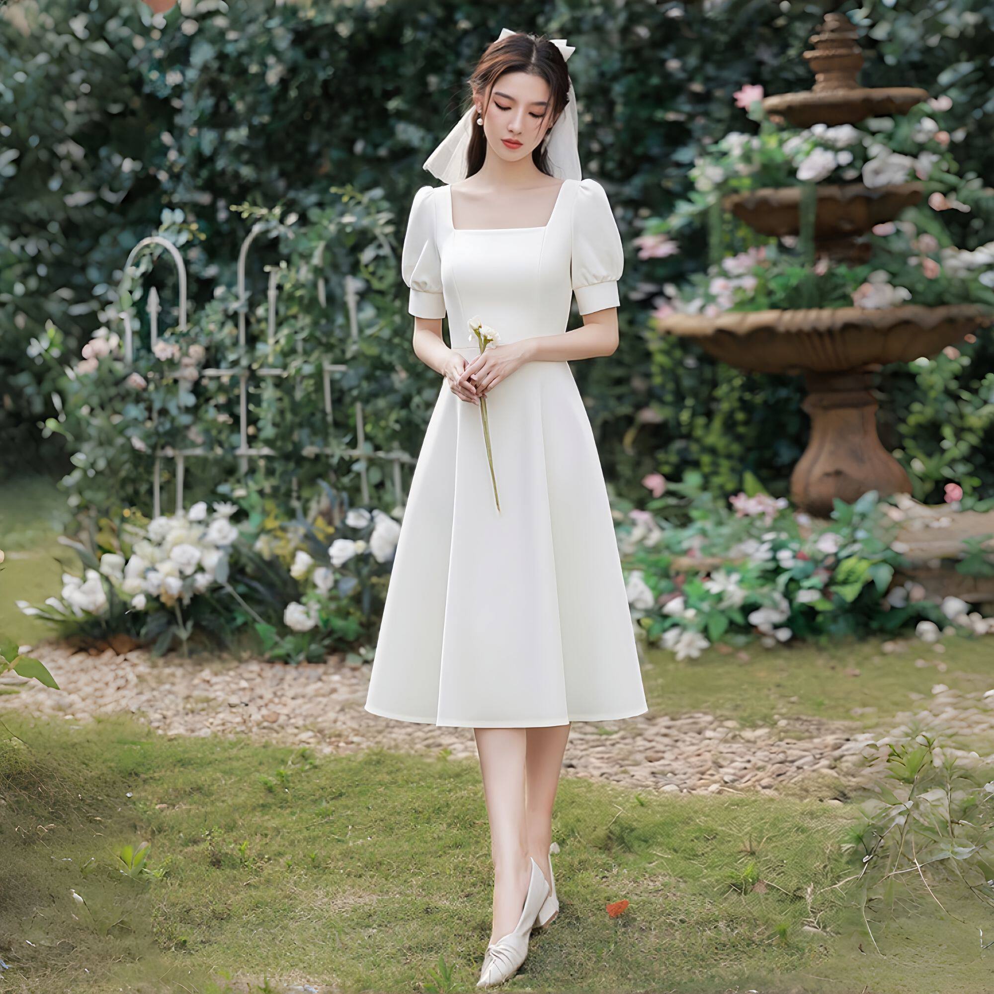 轻奢优雅风白色方领连衣裙女泡泡袖A字裙显瘦小个子领证登记裙子