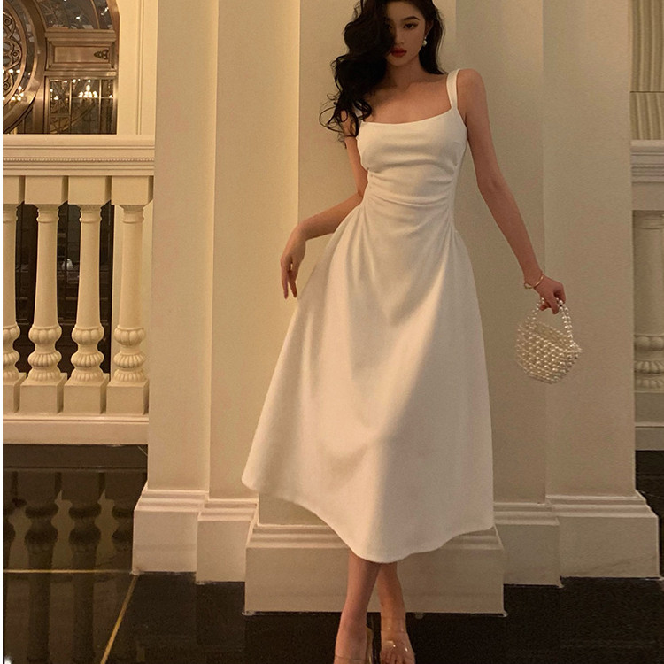 法式白色吊带连衣裙女2025新款收腰裙子高级感领证礼服长裙小个子