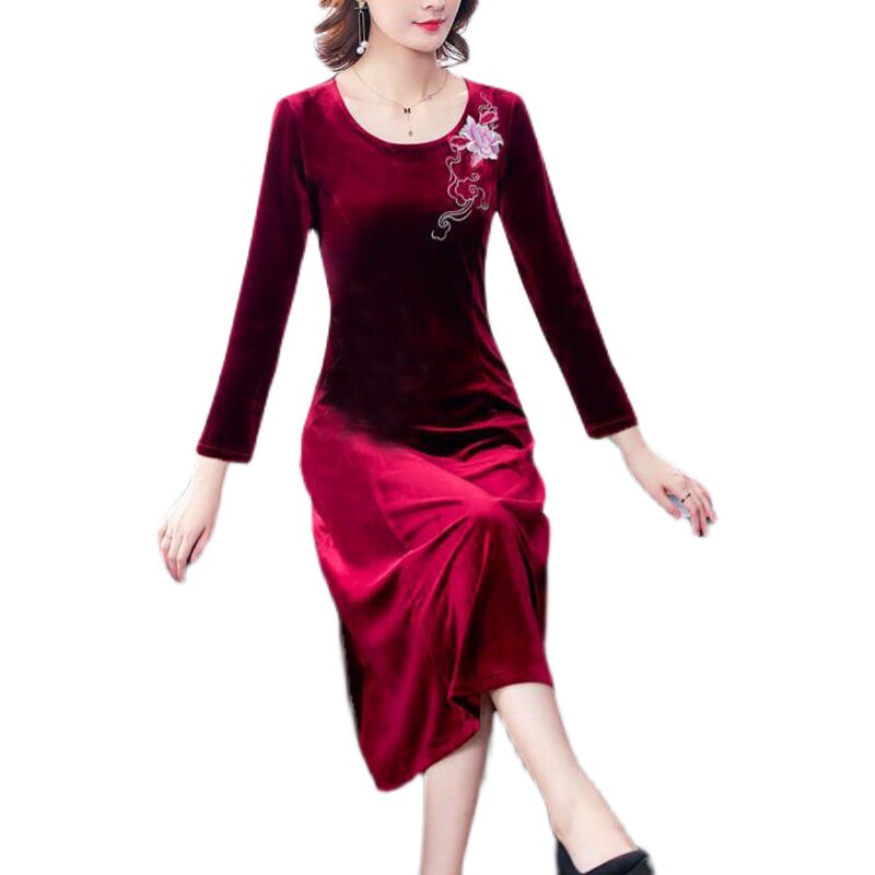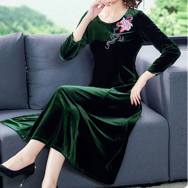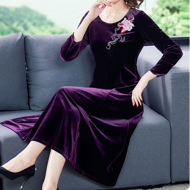 金丝绒绣花连衣裙新款圆领长袖修身显瘦中长款绣花连衣裙妈妈裙