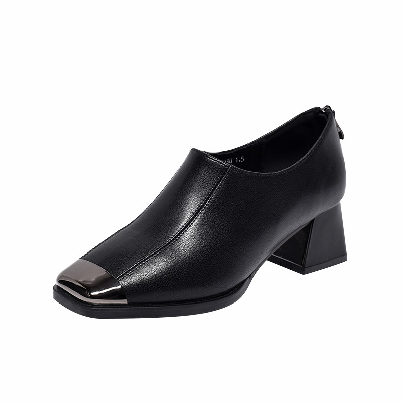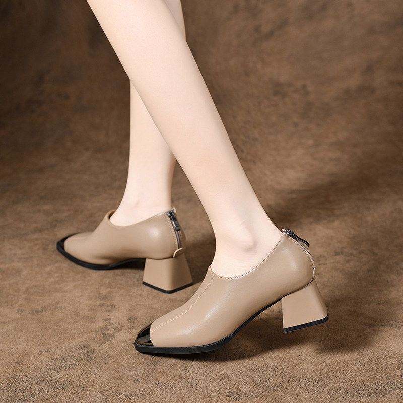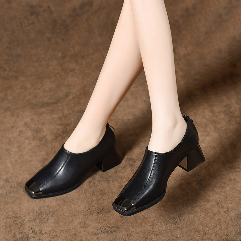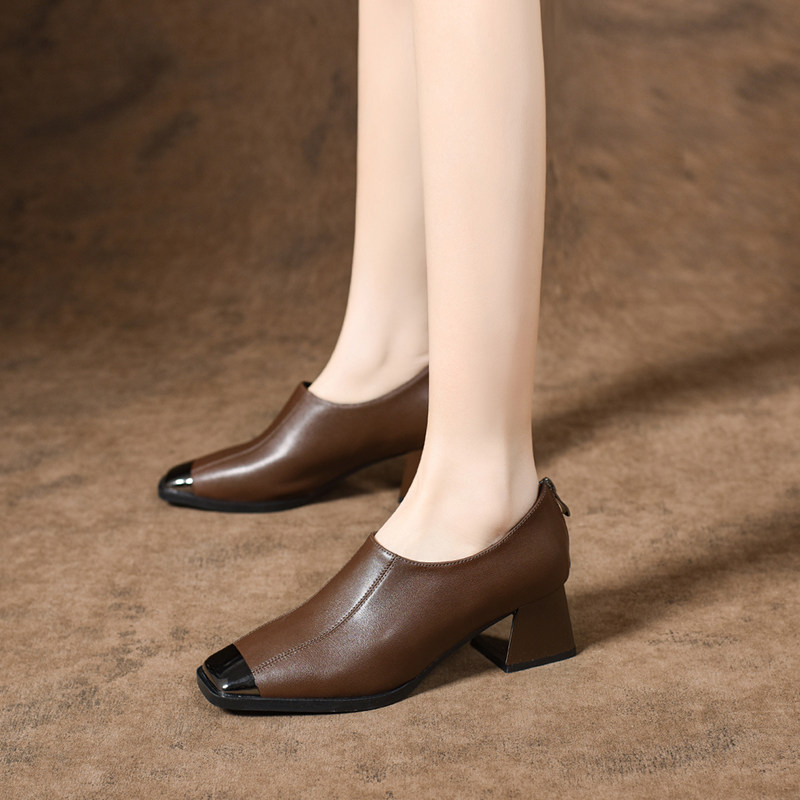 2026新款春款女鞋法式方头粗跟深口单鞋女时尚软皮中跟真皮鞋春秋