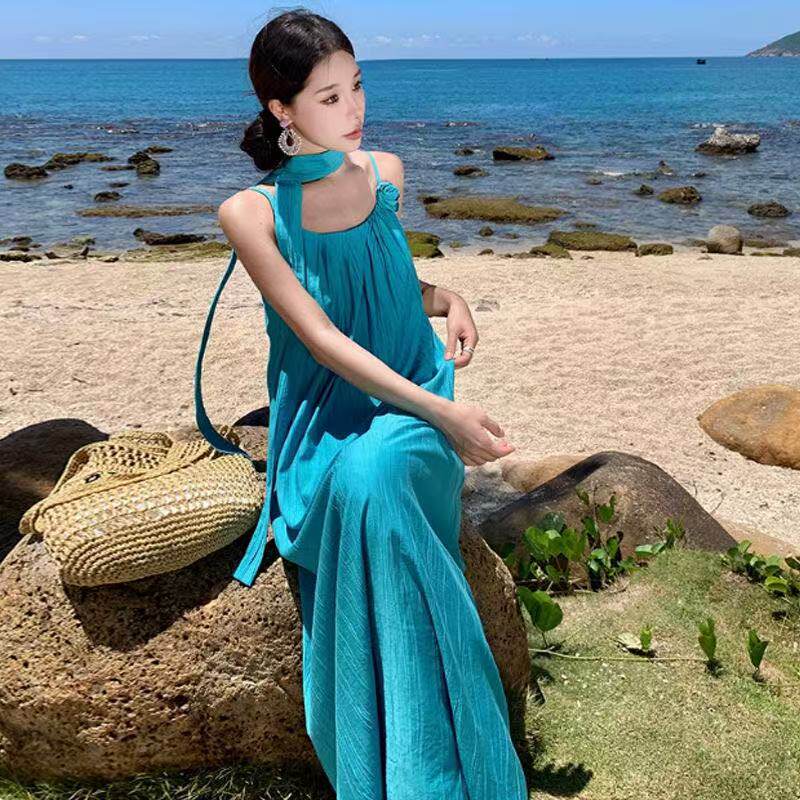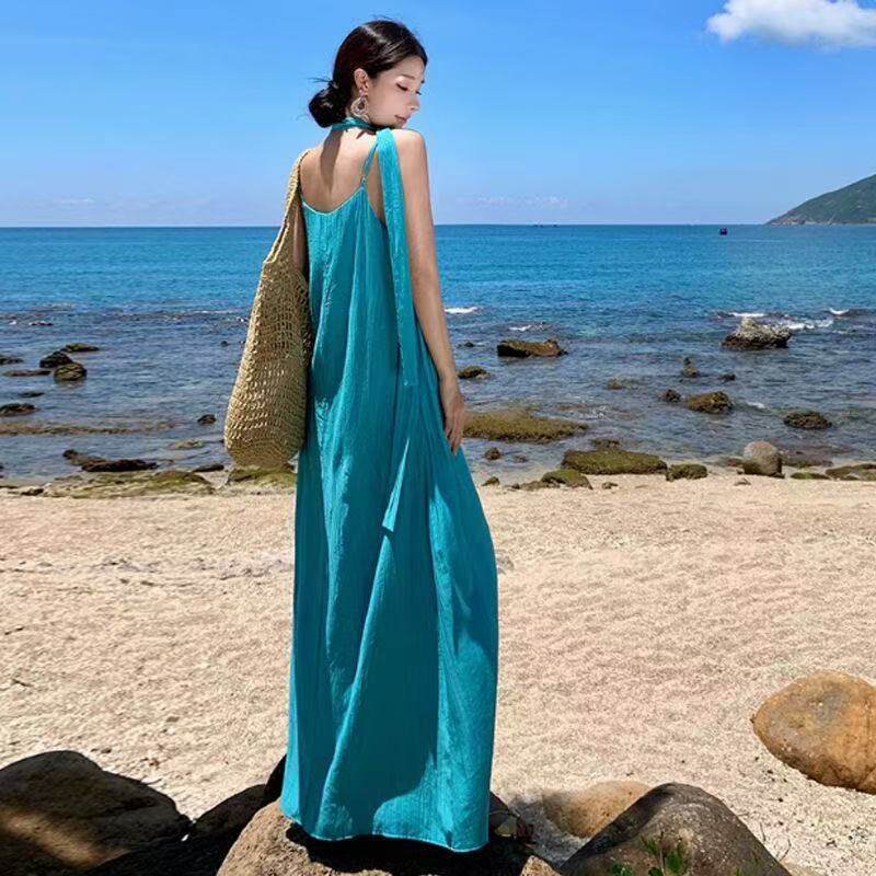 泰国海边沙滩长裙到脚踝超长款度假风高个子宽松褶皱吊带连衣裙夏