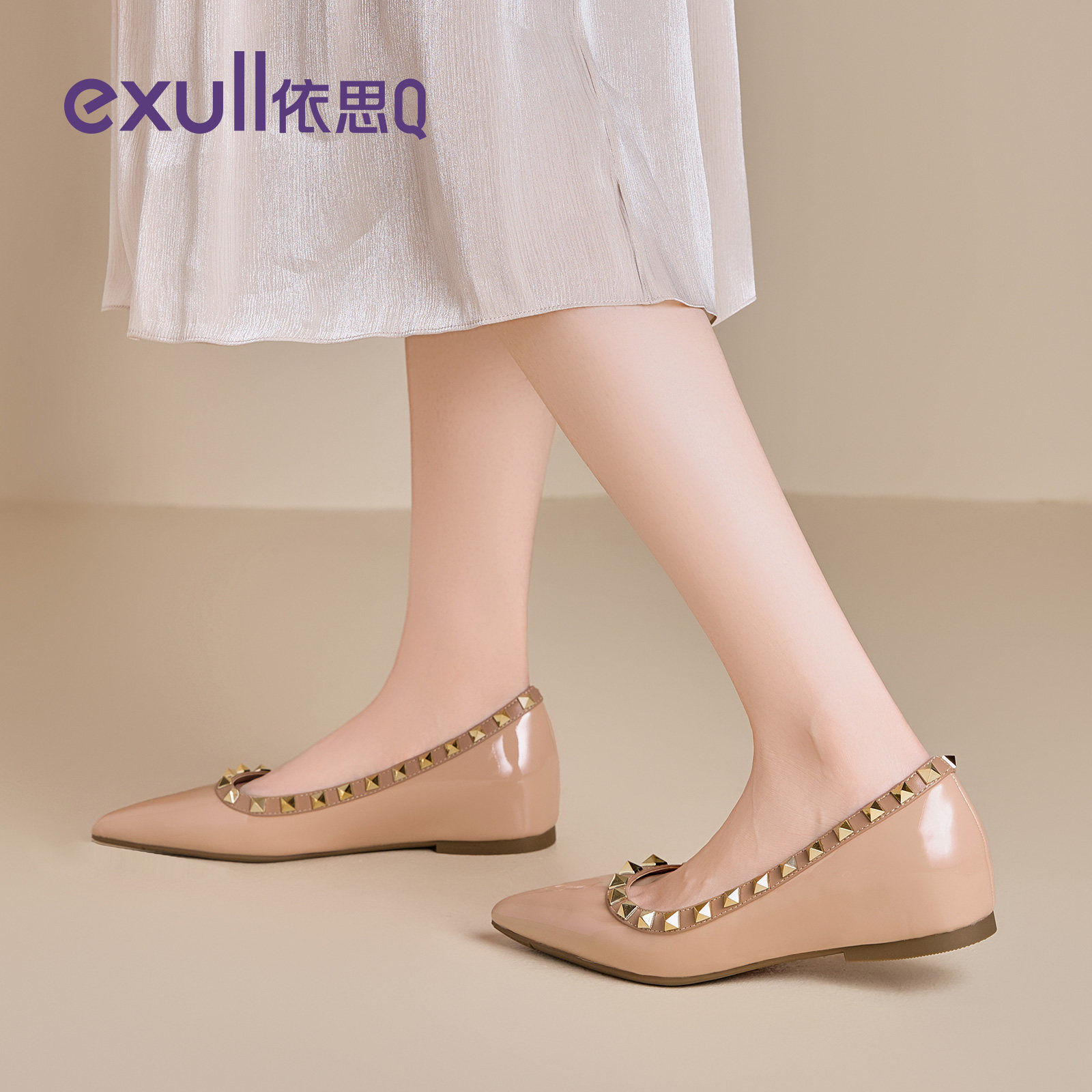 依思q内增高尖头单鞋女2026新款春夏裸色浅口一脚蹬铆钉法式女鞋