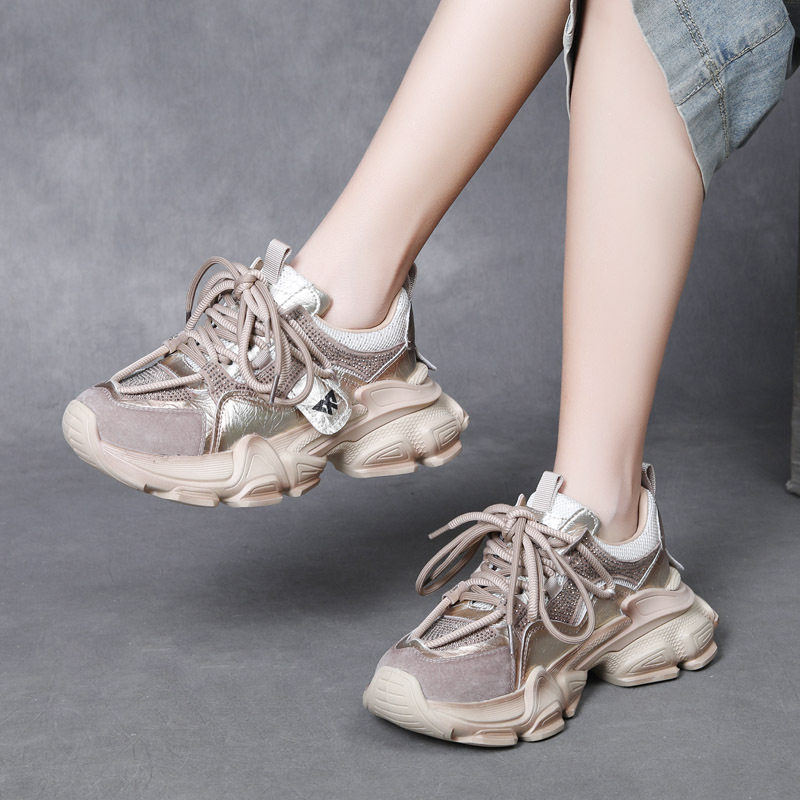 2025新款小个子增高老爹鞋女轻便软底超轻真皮女鞋松糕厚底显脚小