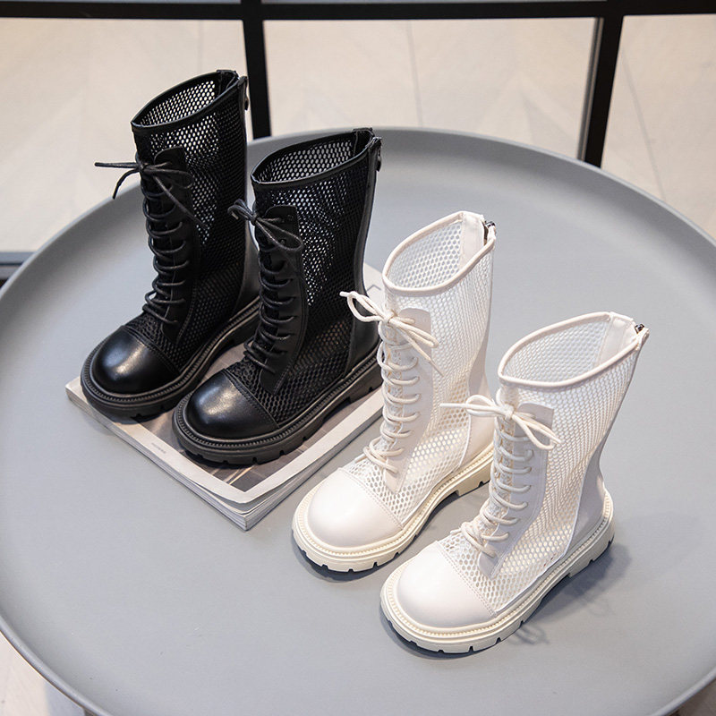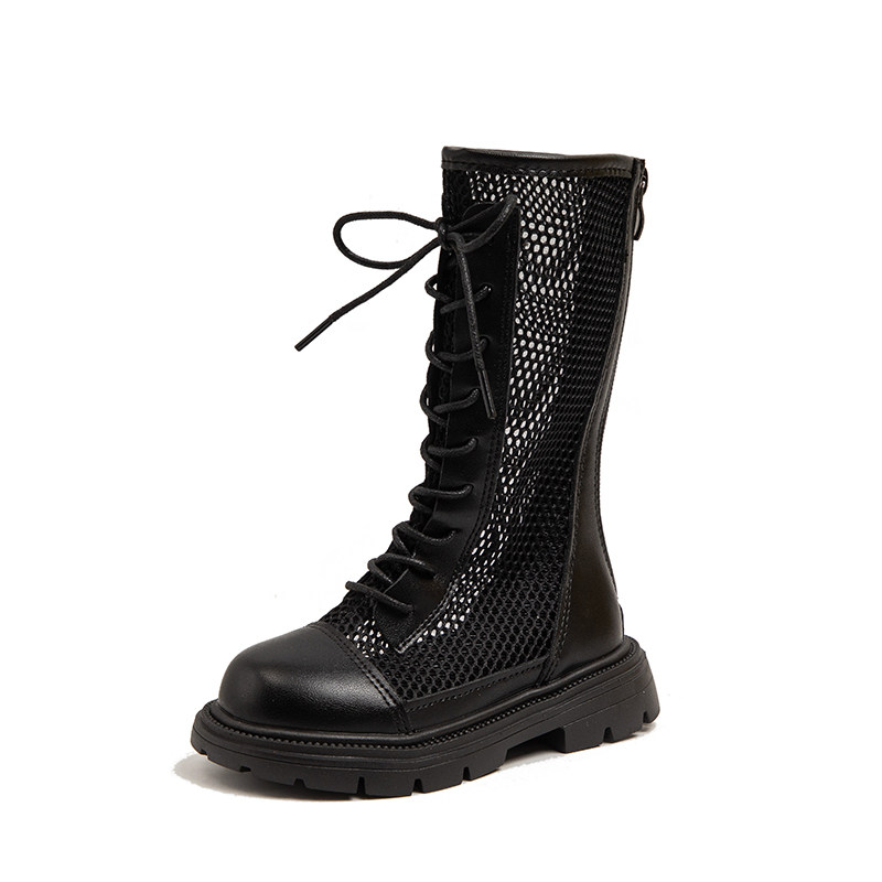 女童靴子夏季马丁靴女款儿童长筒靴夏透气薄款网面小女孩黑色鞋子