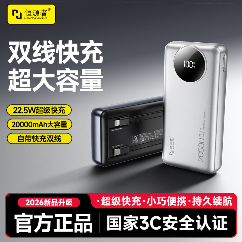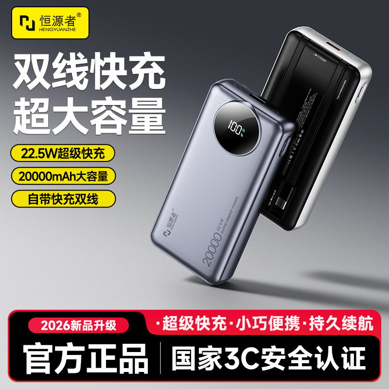 【国标3C认证可上飞机】恒源者新款自带线20000毫安充电宝大容量耐用22.5W双向超级快充便携式移动电源手机