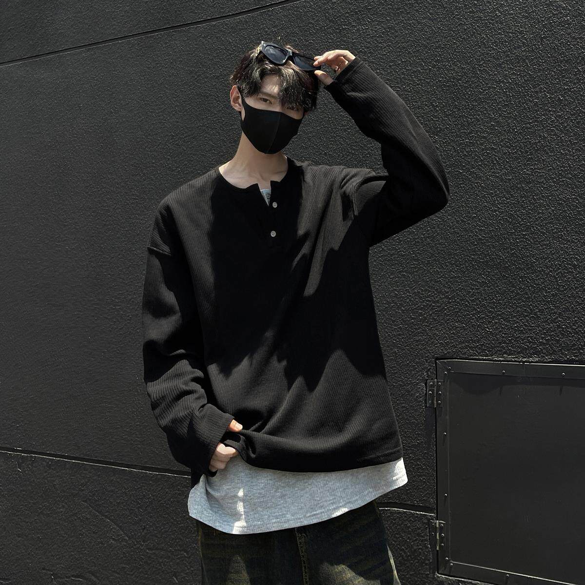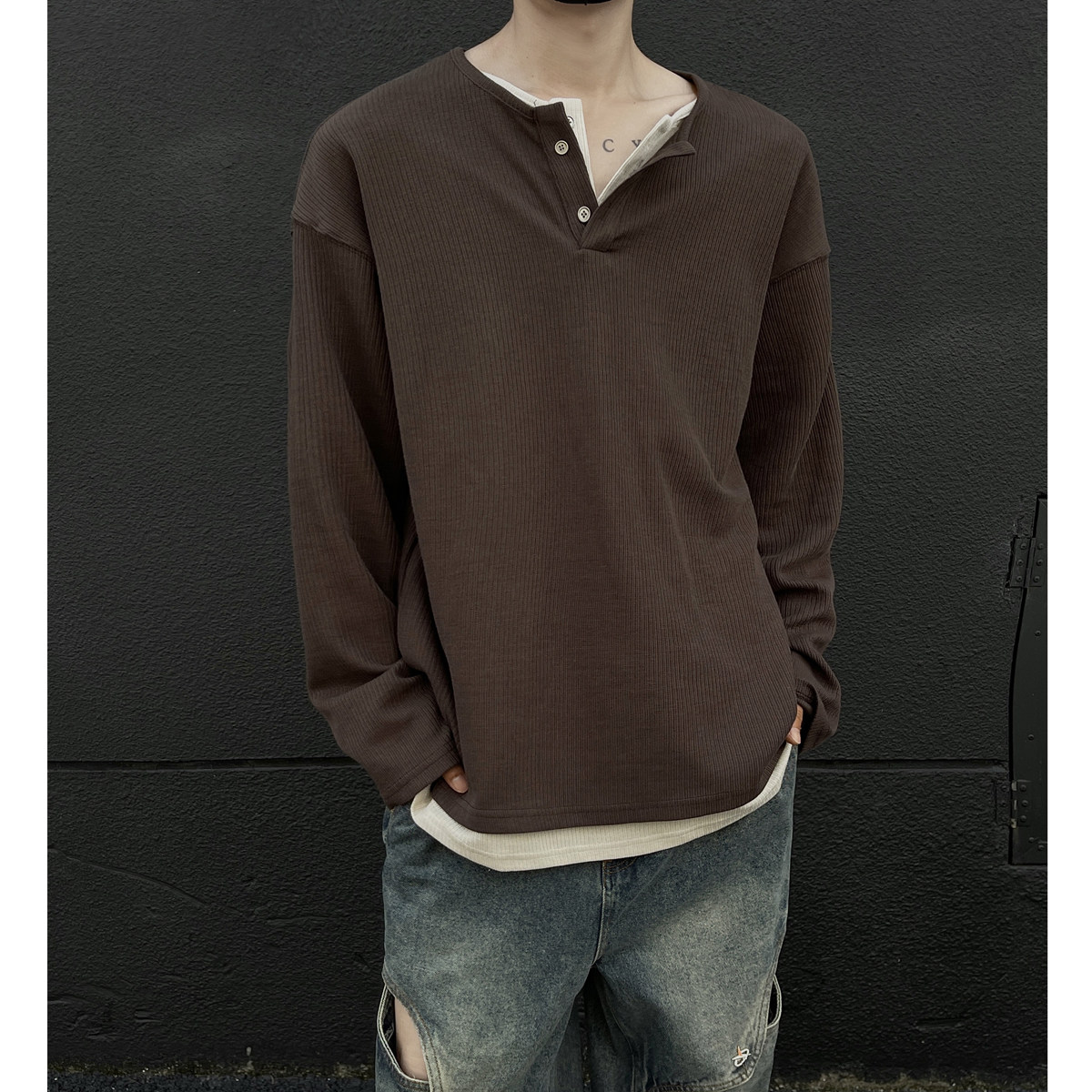 假两件亨利领长袖t恤男款2024春秋新款重磅内搭打底衫宽松上衣服