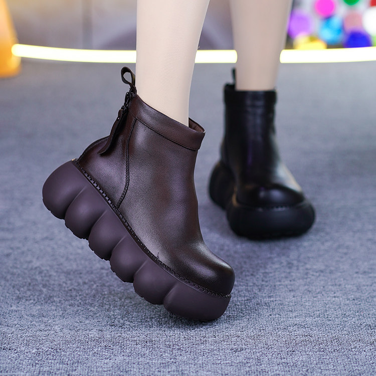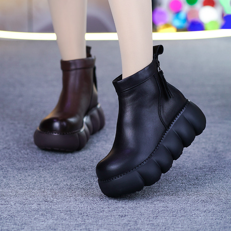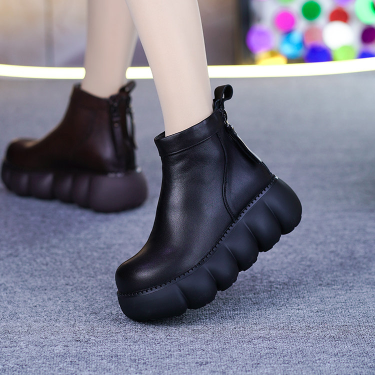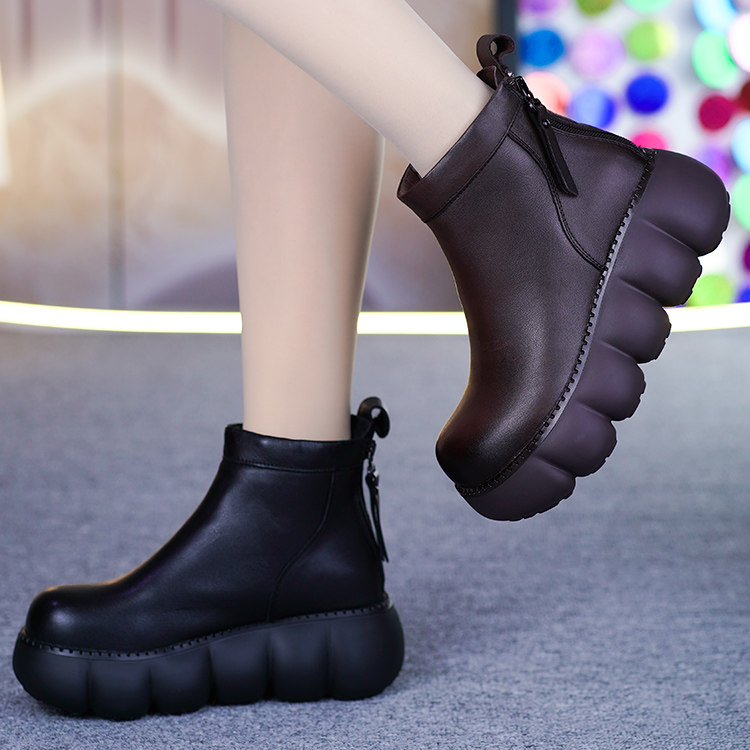 真皮加绒短靴女冬季新款头层牛皮松糕底后拉链厚底坡跟保暖马丁靴