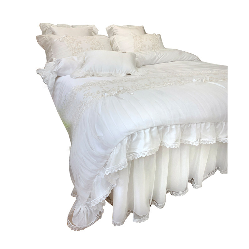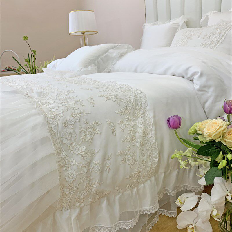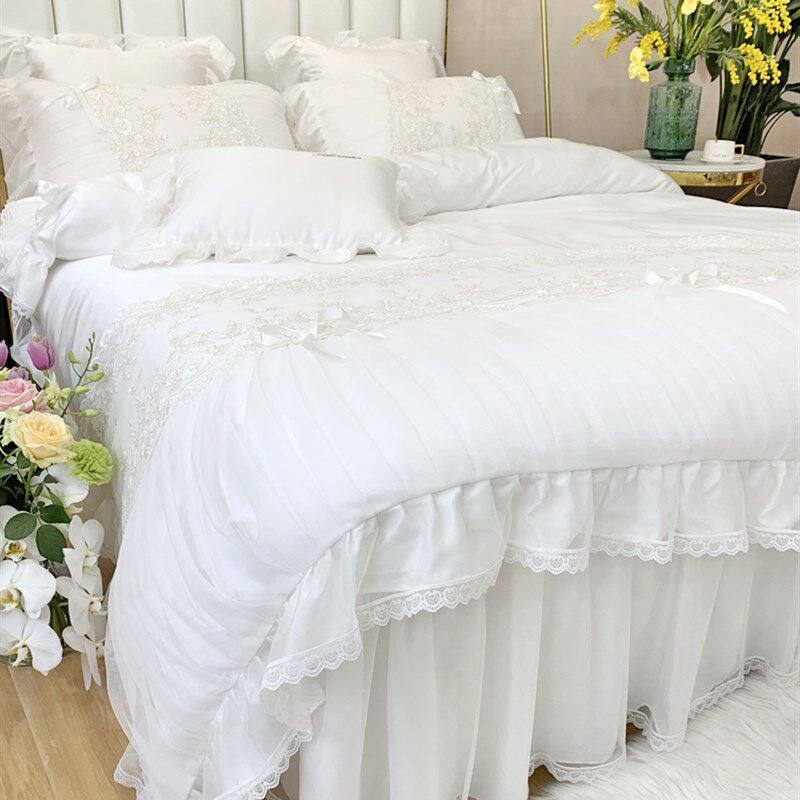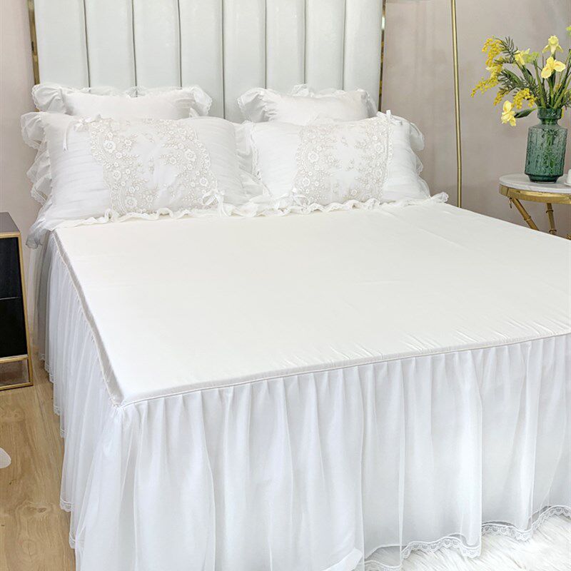 高档蕾丝双面天丝四件套冰丝公主风床裙款白色床单床上用品裸睡夏