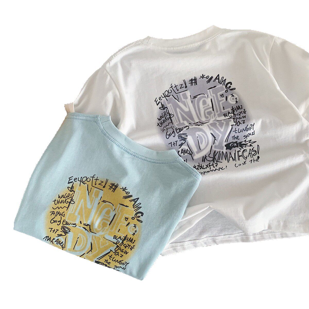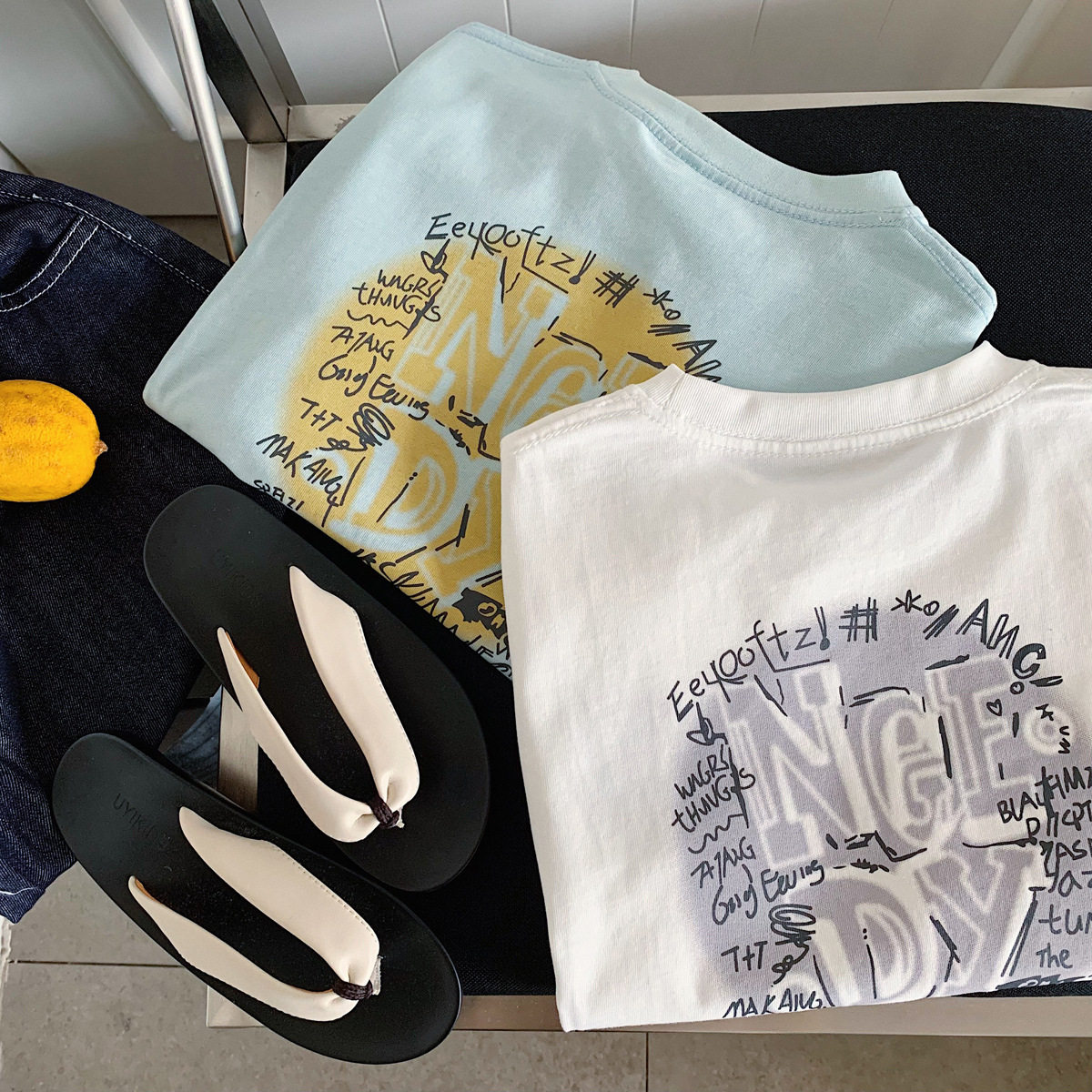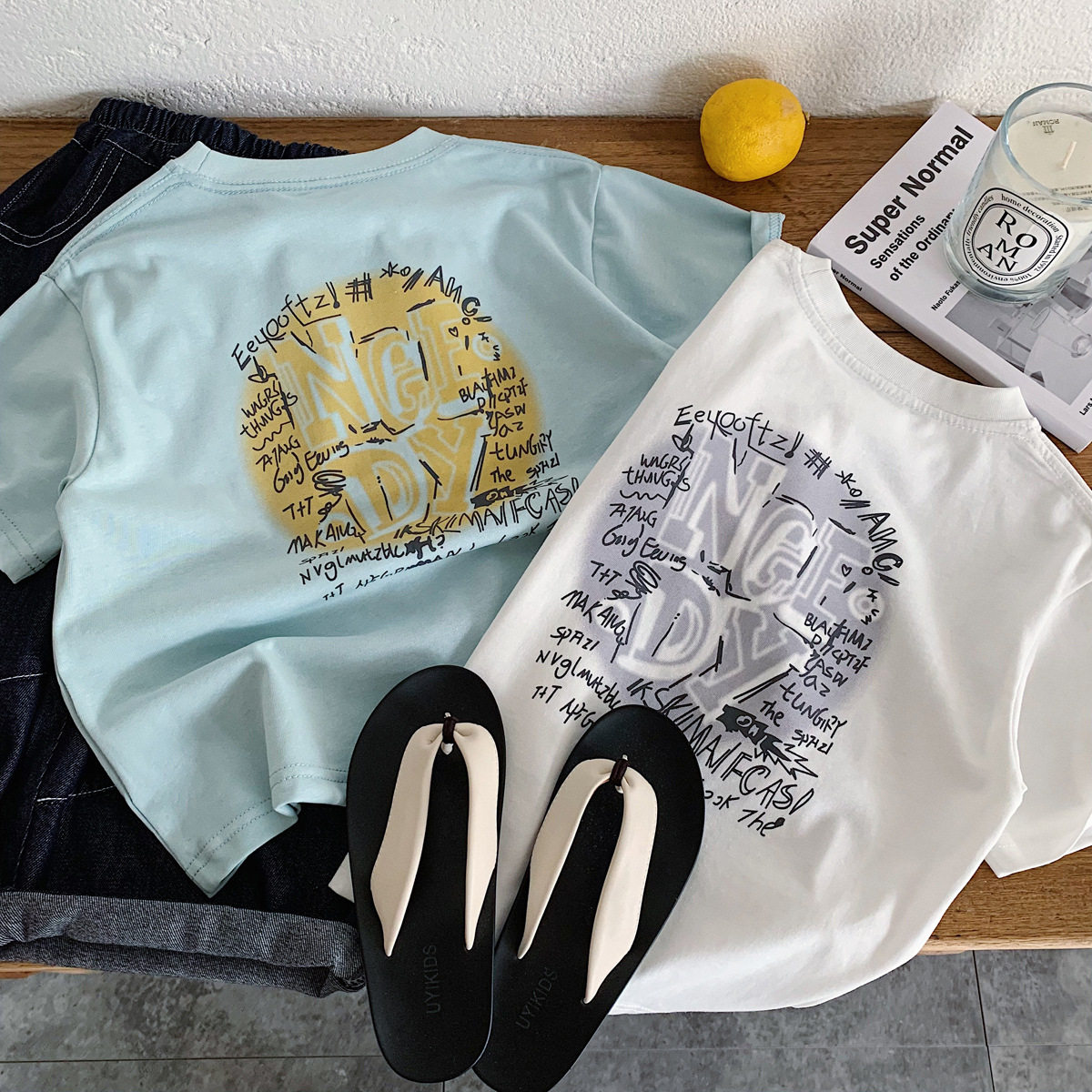 童装薄款美式风韩式圆领短袖T恤男女童纯棉涂鸦印花百搭上衣夏季