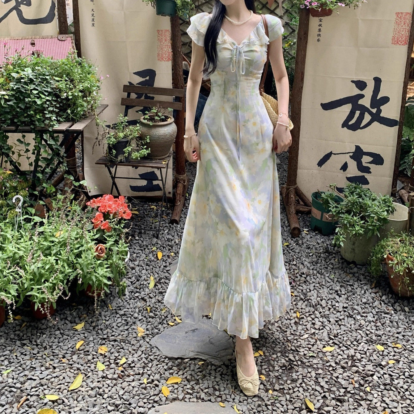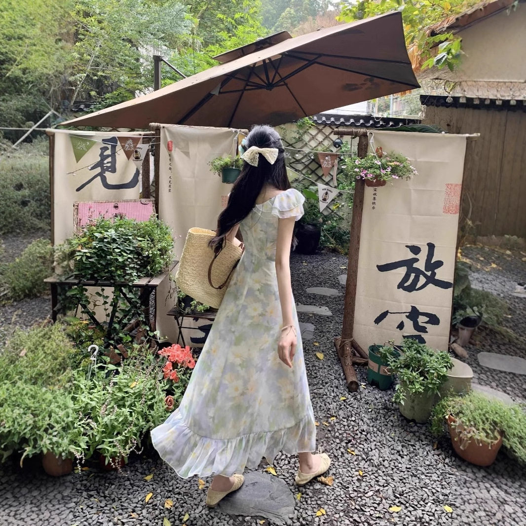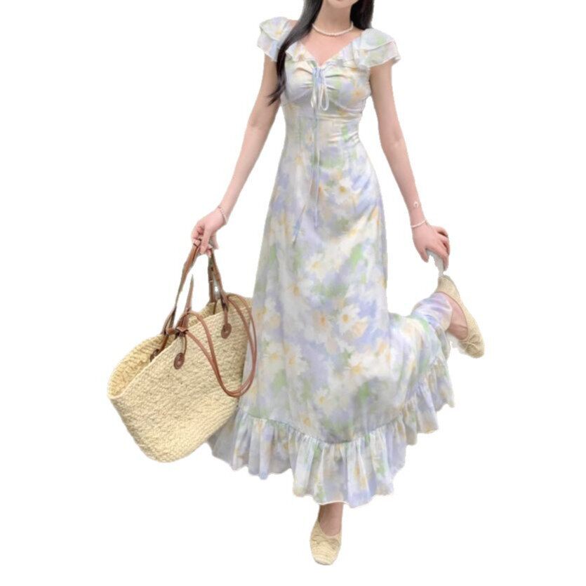 法式碎花荷叶边V领连衣裙夏季新款修身温柔风系带收腰显瘦A字长裙