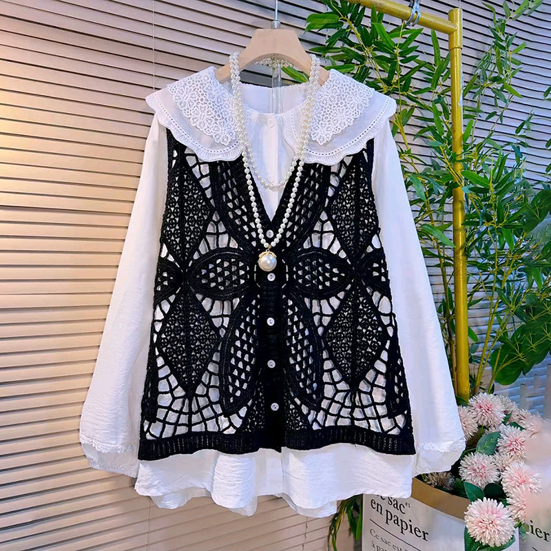 胖妹妹2026春季新款大码女装时尚镂空针织马甲娃娃领衬衫减龄套装