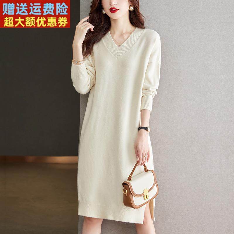 胖mm秋冬大码遮肚子显瘦连衣裙女中长款毛衣宽松200斤羊绒打底裙