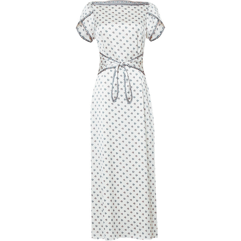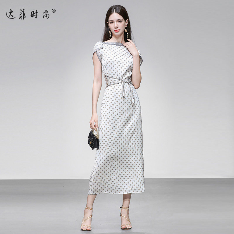 2026年夏季新款法式气质一字肩花苞袖收腰显瘦撞色印花长款连衣裙